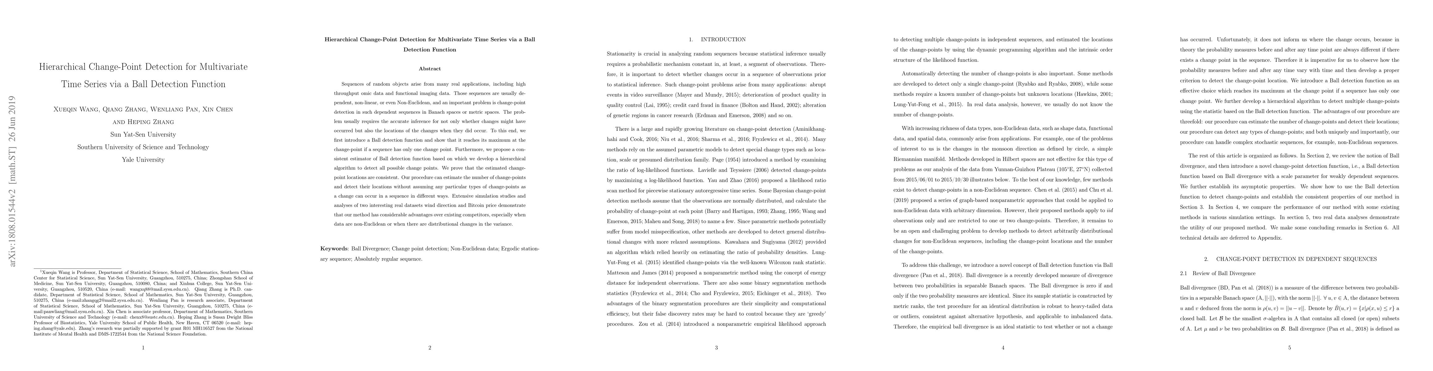 This paper introduces a Ball detection function for detecting change-points in multivariate time series data, especially in non-linear and non-Euclidean spaces. It proposes a hierarchical algorithm based on this function, demonstrating consistent estimation of change-point locations and outperforming existing methods in simulations and real-world datasets.