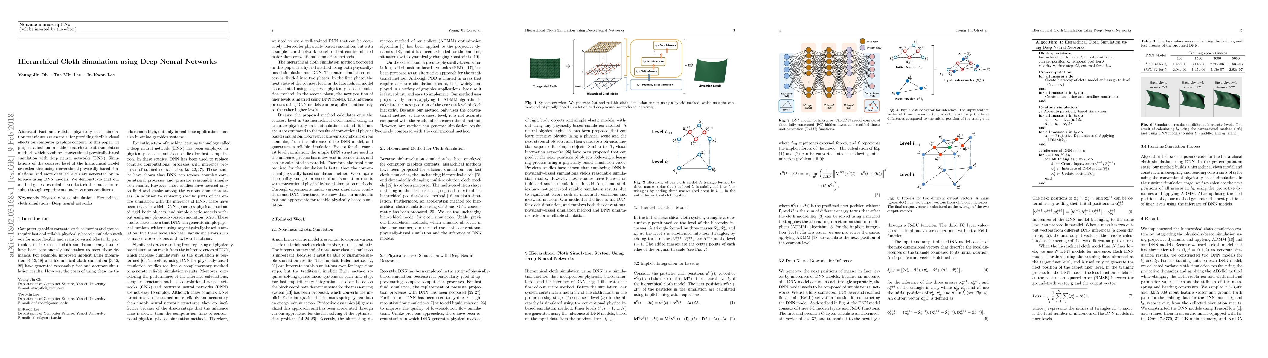 This paper proposes a hierarchical cloth simulation method that combines conventional physically-based simulations with deep neural networks for faster and more reliable results. The method uses DNNs for detailed simulation levels, demonstrating effective performance through experiments.