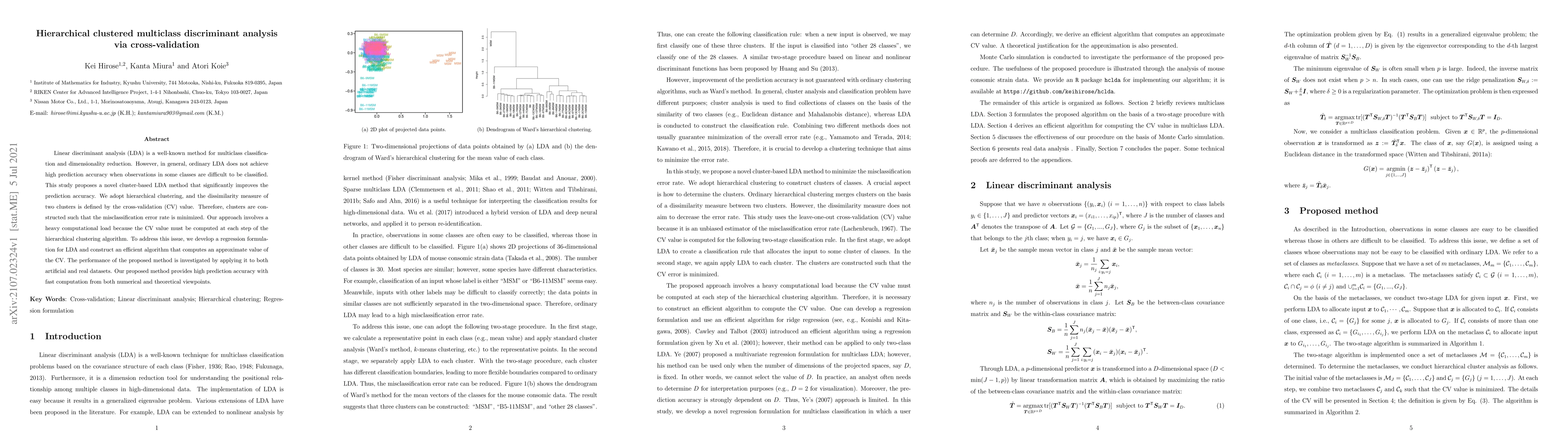 Linear discriminant analysis (LDA) is a well-known method for multiclass classification and dimensionality reduction. However, in general, ordinary LDA does not achieve high prediction accuracy when observations in some classes are difficult to be classified. This study proposes a novel cluster-based LDA method that significantly improves the prediction accuracy. We adopt hierarchical clustering, and the dissimilarity measure of two clusters is defined by the cross-validation (CV) value. Therefore, clusters are constructed such that the misclassification error rate is minimized. Our approach involves a heavy computational load because the CV value must be computed at each step of the hierarchical clustering algorithm. To address this issue, we develop a regression formulation for LDA and construct an efficient algorithm that computes an approximate value of the CV. The performance of the proposed method is investigated by applying it to both artificial and real datasets. Our proposed method provides high prediction accuracy with fast computation from both numerical and theoretical viewpoints.