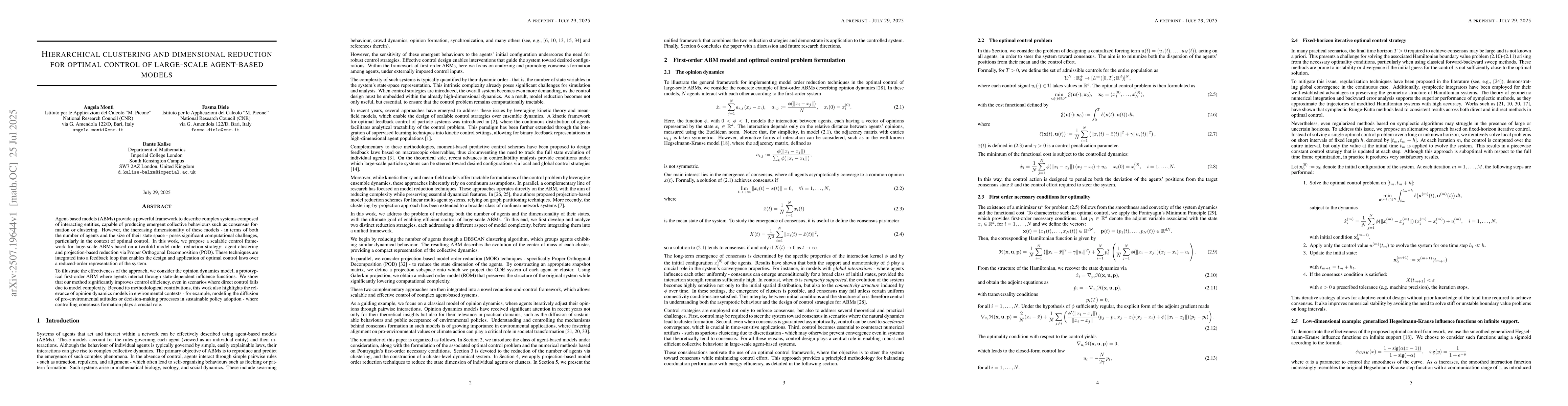 Agent-based models (ABMs) provide a powerful framework to describe complex systems composed of interacting entities, capable of producing emergent collective behaviours such as consensus formation or clustering. However, the increasing dimensionality of these models -- in terms of both the number of agents and the size of their state space -- poses significant computational challenges, particularly in the context of optimal control. In this work, we propose a scalable control frame work for large-scale ABMs based on a twofold model order reduction strategy: agent clustering and projection-based reduction via Proper Orthogonal Decomposition (POD). These techniques are integrated into a feedback loop that enables the design and application of optimal control laws over a reduced-order representation of the system. To illustrate the effectiveness of the approach, we consider the opinion dynamics model, a prototyp ical first-order ABM where agents interact through state-dependent influence functions. We show that our method significantly improves control efficiency, even in scenarios where direct control fails due to model complexity. Beyond its methodological contributions, this work also highlights the rel evance of opinion dynamics models in environmental contexts -- for example, modeling the diffusion of pro-environmental attitudes or decision-making processes in sustainable policy adoption -- where controlling consensus formation plays a crucial role.