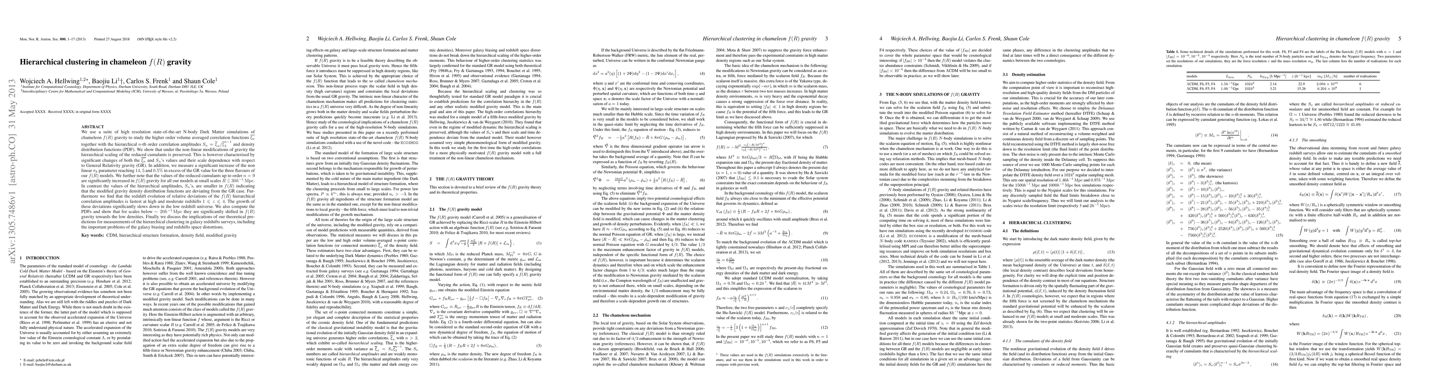 This paper investigates the effects of chameleon $f(R)$ gravity on the hierarchical clustering in dark matter simulations, finding significant deviations from General Relativity in higher-order correlation functions and density distribution. The study reveals increased non-linear clustering parameters and altered density distributions, with implications for galaxy biasing and redshift space distortions in surveys.