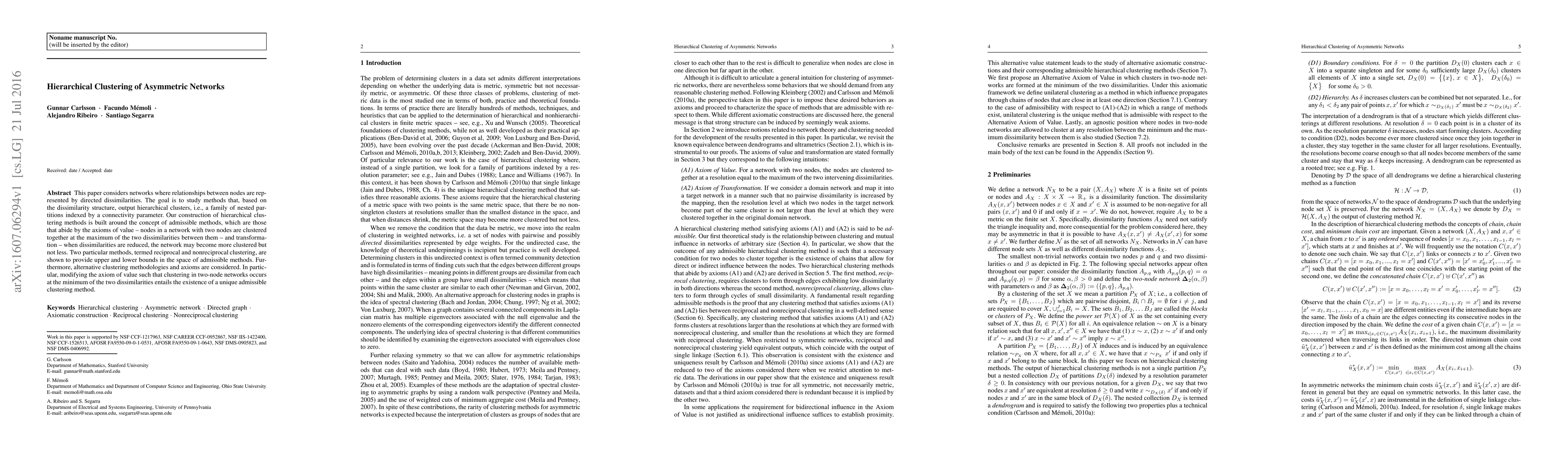 This paper explores hierarchical clustering methods for asymmetric networks, focusing on directed dissimilarities and constructing methods that adhere to value and transformation axioms. It identifies reciprocal and nonreciprocal clustering as bounds within admissible methods and discusses alternative clustering approaches.