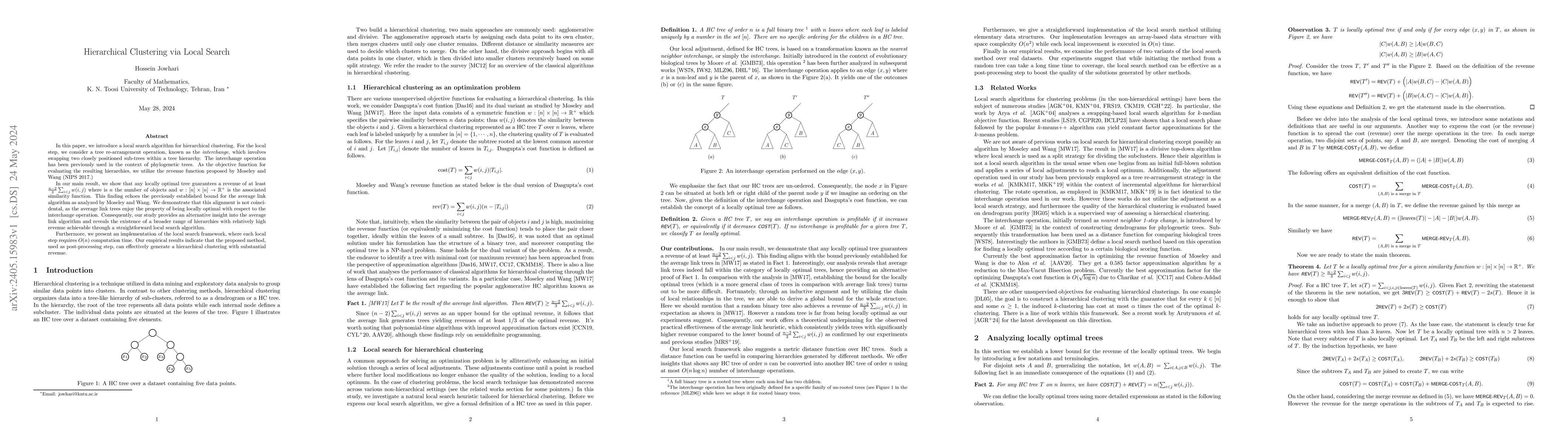 This paper introduces a local search algorithm for hierarchical clustering using tree re-arrangement operations called interchanges. It demonstrates that locally optimal trees achieve a revenue bound similar to the average link algorithm, providing deeper insight into the latter and revealing a wide range of high-revenue hierarchies obtainable via simple local searches. The method is efficiently implemented with each local step requiring O(n) time and empirically shows effective clustering results.