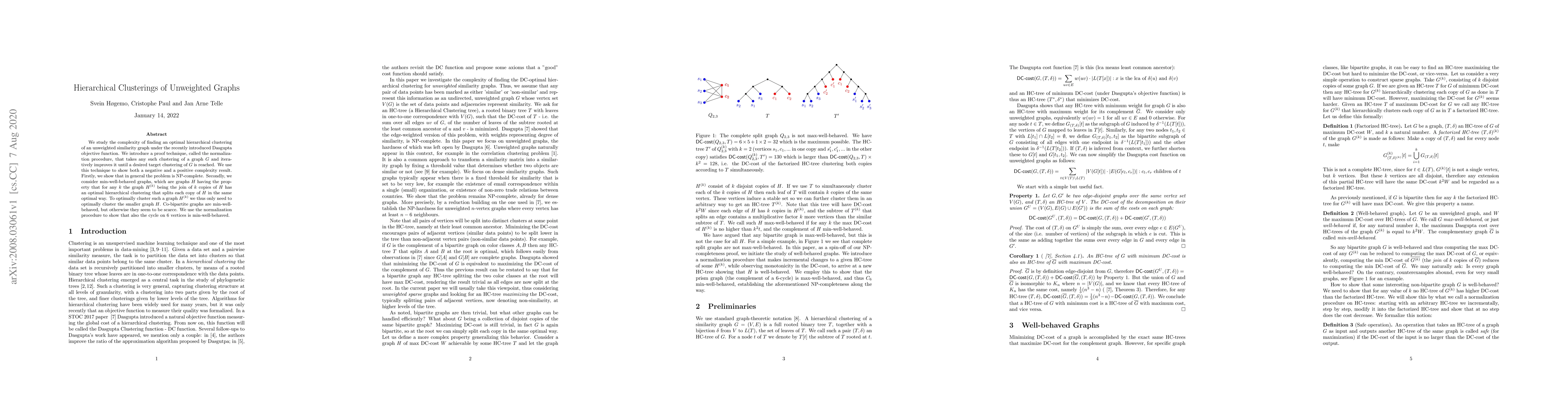 We study the complexity of finding an optimal hierarchical clustering of an unweighted similarity graph under the recently introduced Dasgupta objective function. We introduce a proof technique, called the normalization procedure, that takes any such clustering of a graph $G$ and iteratively improves it until a desired target clustering of G is reached. We use this technique to show both a negative and a positive complexity result. Firstly, we show that in general the problem is NP-complete. Secondly, we consider min-well-behaved graphs, which are graphs $H$ having the property that for any $k$ the graph $H(k)$ being the join of $k$ copies of $H$ has an optimal hierarchical clustering that splits each copy of $H$ in the same optimal way. To optimally cluster such a graph $H(k)$ we thus only need to optimally cluster the smaller graph $H$. Co-bipartite graphs are min-well-behaved, but otherwise they seem to be scarce. We use the normalization procedure to show that also the cycle on 6 vertices is min-well-behaved.