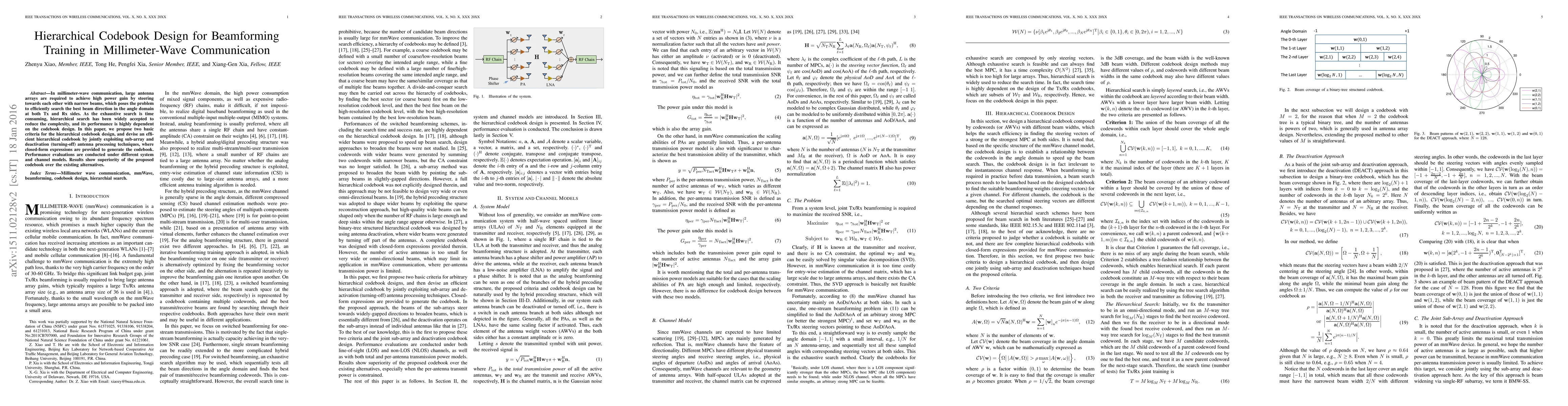 This paper proposes an efficient hierarchical codebook design for beamforming training in millimeter-wave communication, leveraging sub-array and deactivation techniques. The proposed codebook outperforms existing methods, as demonstrated through performance evaluations under various system and channel models.