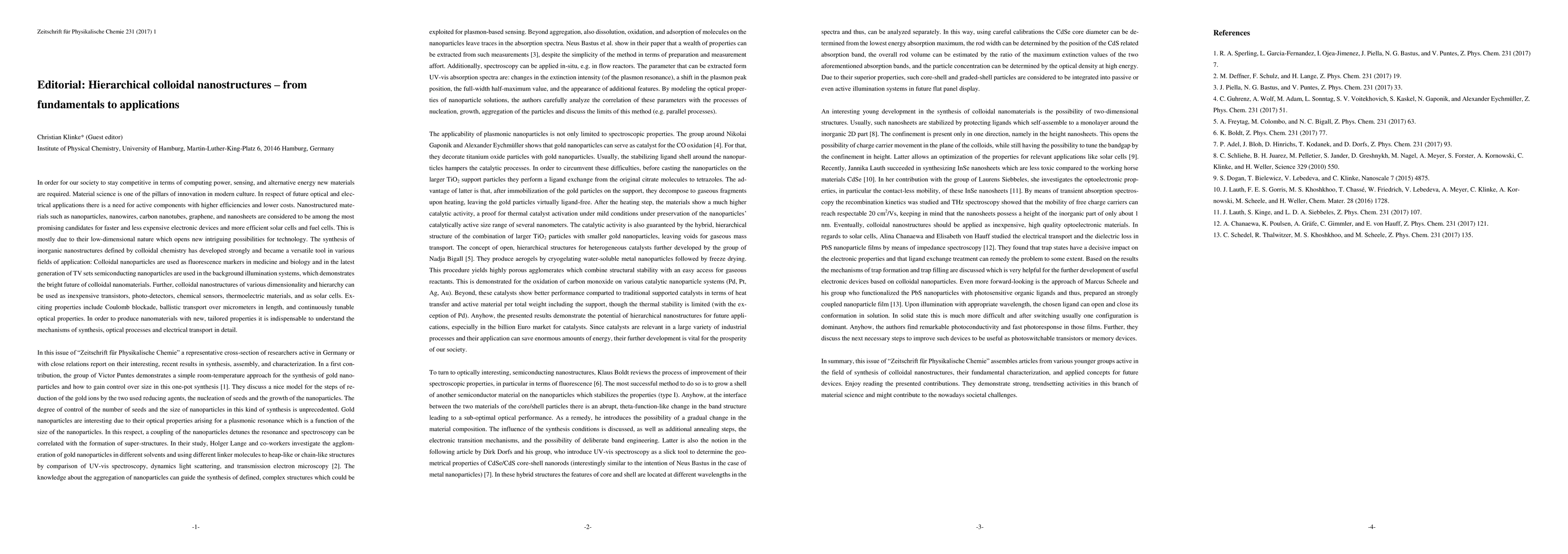 Editorial for the Special Issue of "Zeitschrift fuer Physikalische Chemie" on "Hierarchical Colloidal Nanostructures"