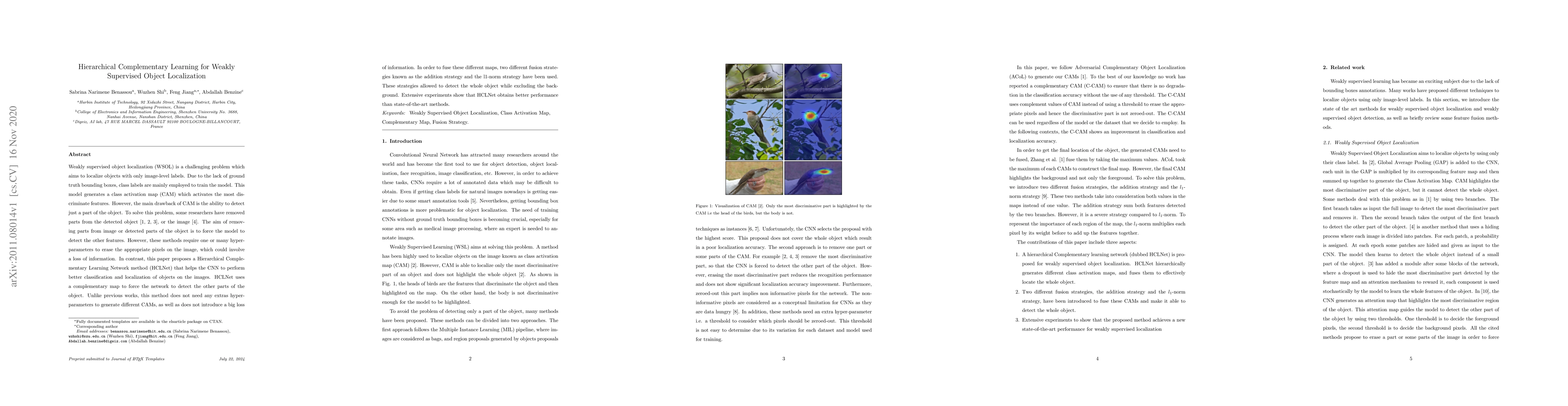 A new method called Hierarchical Complementary Learning Network (HCLNet) is proposed to improve object localization in images with weak supervision, achieving better performance than state-of-the-art methods.