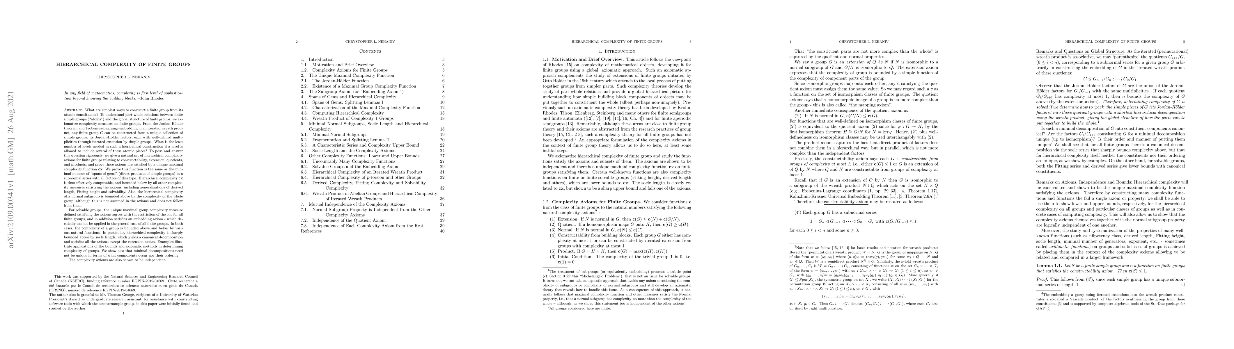 What are simplest ways to construct a finite group from its atomic constituents? To understand part-whole relations between finite simple groups and the global structure of finite groups, we axiomatize complexity measures on finite groups. From the Jordan-H\"older theorem and Frobenius-Lagrange embedding in an iterated wreath product, any finite group $G$ can be constructed from a unique collection of simple groups, its Jordan-H\"older factors, each with well-defined multiplicities through iterated extension. What is the least number of levels needed in such a hierarchical construction if a level is allowed to include several of these atomic pieces? To answer this question rigorously, we give a natural set of hierarchical complexity axioms for finite groups, and prove these axioms are satisfied by a unique maximal complexity function $\mathbf{cx}$. We prove this function is the same as the minimal number of "spans of gems" (direct products of simple groups) in a subnormal series with all factors of this type. This hierarchical complexity is thus effectively computable, and bounded below by all other complexity measures satisfying the axioms, including generalizations of derived length and Fitting height. For solvable groups, the unique maximal group complexity measure satisfying the axioms agrees with the restriction of the one for all finite groups, and in addition satisfies an embedding axiom. In both cases, the complexity of a group is bounded above and below by various natural functions. In particular, hierarchical complexity is sharply bounded above by socle length, with a canonical decomposition. Examples illustrate applications of the bounds and axiomatic methods in determining complexity of groups. We show also that minimal decompositions need not be unique in terms of what components occur nor their ordering. The complexity axioms are also shown to be independent.
