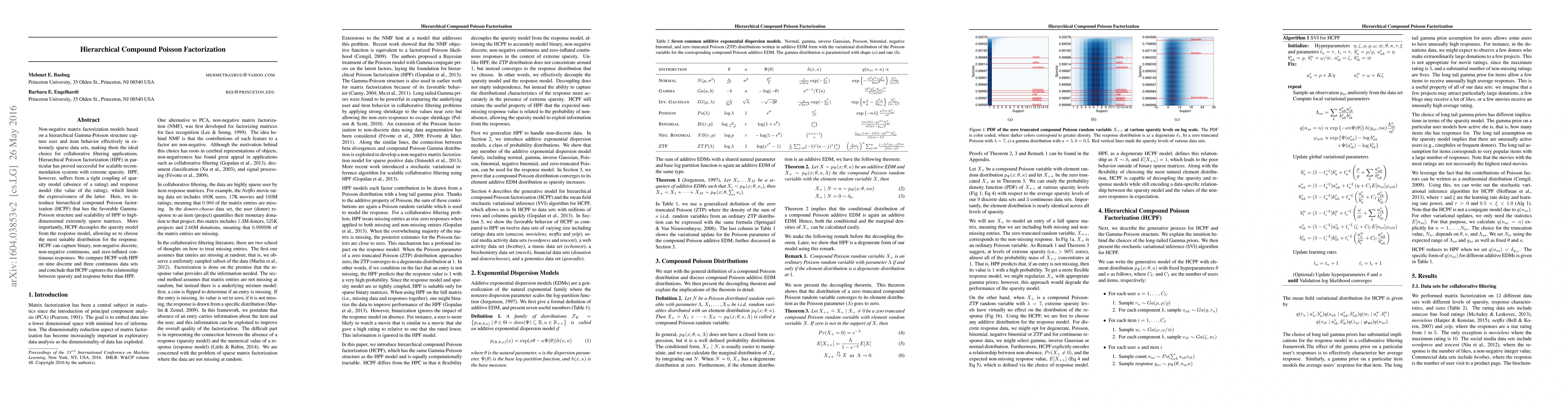 The paper proposes hierarchical compound Poisson factorization (HCPF), which enhances the scalability and flexibility of hierarchical Poisson factorization (HPF) for collaborative filtering. Unlike HPF, HCPF decouples the sparsity model from the response model, allowing more suitable response distributions for binary, discrete, continuous, and zero-inflated data. Experimental results show HCPF outperforms HPF in capturing relationships in sparse datasets.