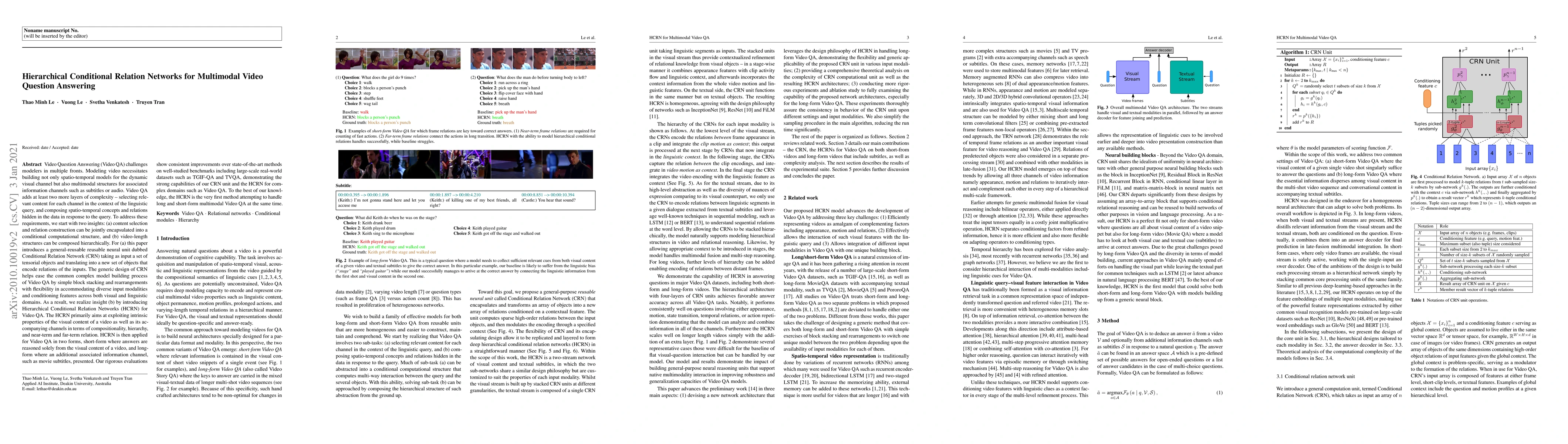 This paper introduces Hierarchical Conditional Relation Networks (HCRN) for multimodal Video Question Answering, utilizing Conditional Relation Networks (CRN) to jointly encapsulate content selection and relation construction. HCRN demonstrates consistent improvements over state-of-the-art methods on benchmarks, showcasing its effectiveness in handling both short-form and long-form video questions.