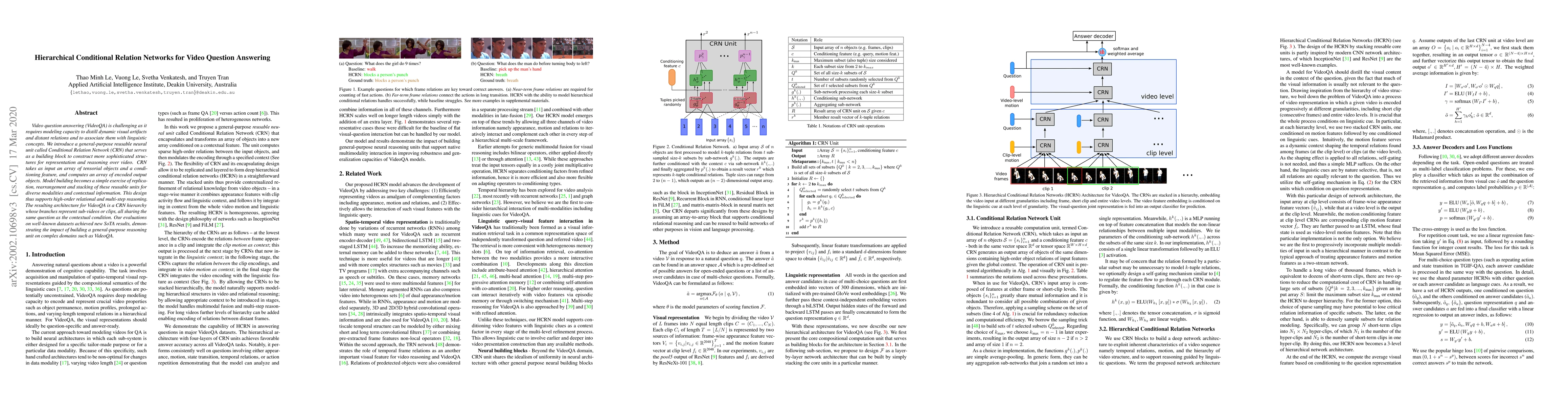 The research introduces Conditional Relation Networks (CRNs), a reusable neural unit, for constructing hierarchical structures for video question answering (VideoQA). CRNs encode high-order relations among input objects conditioned on a global context, supporting high-order relational and multi-step reasoning.