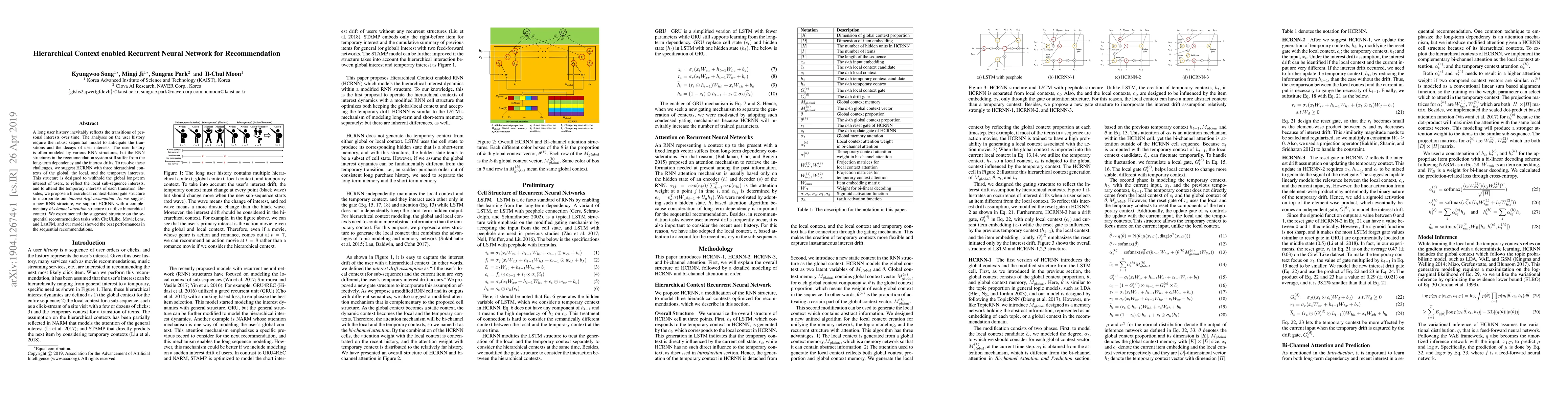 A long user history inevitably reflects the transitions of personal interests over time. The analyses on the user history require the robust sequential model to anticipate the transitions and the decays of user interests. The user history is often modeled by various RNN structures, but the RNN structures in the recommendation system still suffer from the long-term dependency and the interest drifts. To resolve these challenges, we suggest HCRNN with three hierarchical contexts of the global, the local, and the temporary interests. This structure is designed to withhold the global long-term interest of users, to reflect the local sub-sequence interests, and to attend the temporary interests of each transition. Besides, we propose a hierarchical context-based gate structure to incorporate our \textit{interest drift assumption}. As we suggest a new RNN structure, we support HCRNN with a complementary \textit{bi-channel attention} structure to utilize hierarchical context. We experimented the suggested structure on the sequential recommendation tasks with CiteULike, MovieLens, and LastFM, and our model showed the best performances in the sequential recommendations.