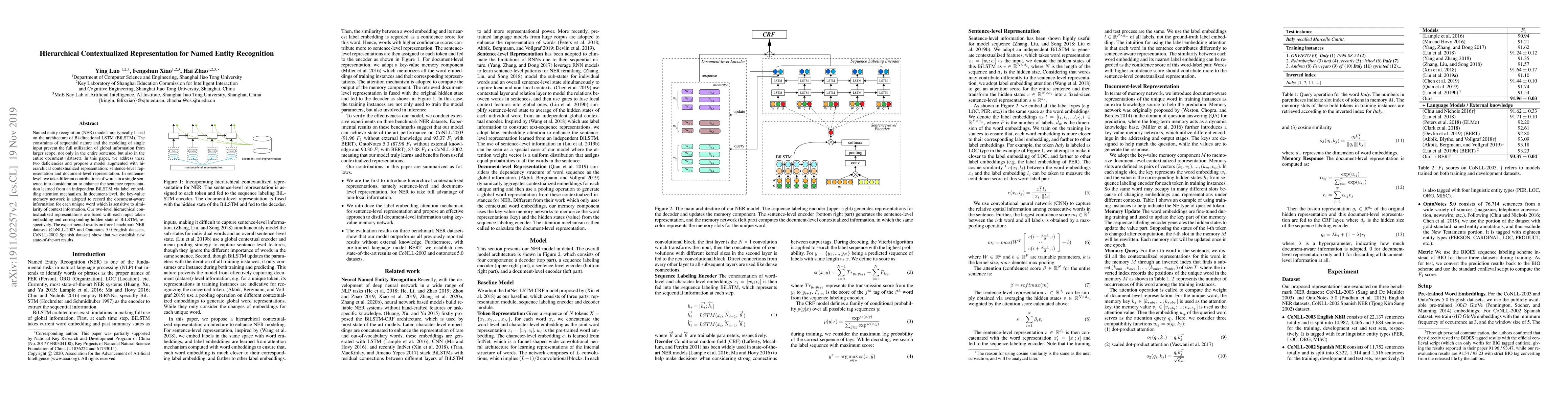 This paper proposes a hierarchical contextualized representation model for named entity recognition (NER) that incorporates sentence-level and document-level information to enhance model performance. The model uses a BiLSTM with label embedding attention for sentence-level representation and a key-value memory network for document-level representation, achieving state-of-the-art results on three benchmark datasets.