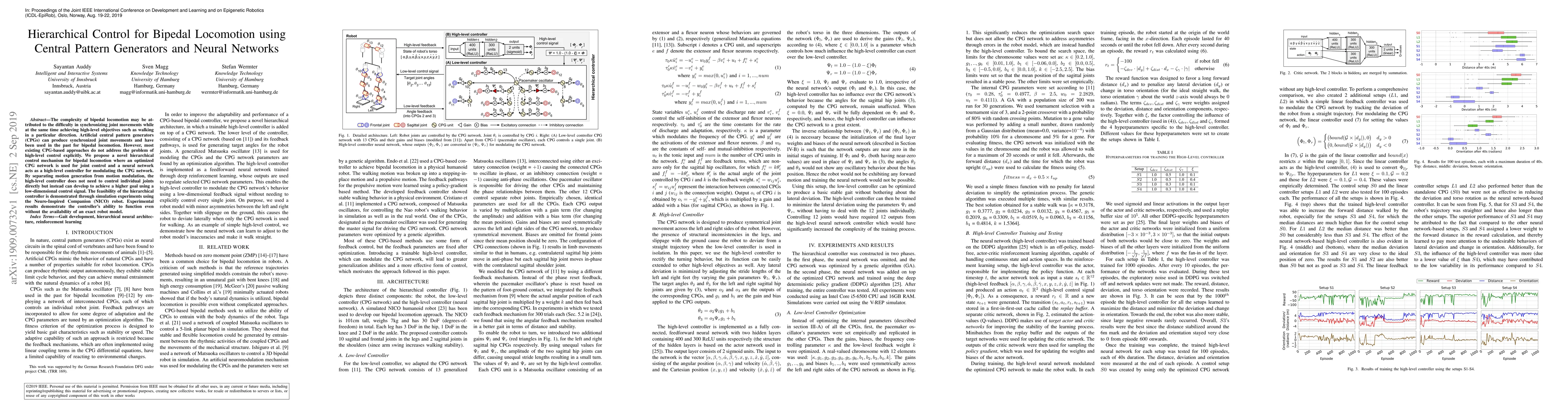 The paper presents a novel hierarchical control mechanism combining optimized CPG networks and neural networks for bipedal locomotion, enabling effective high-level control without explicit joint control.