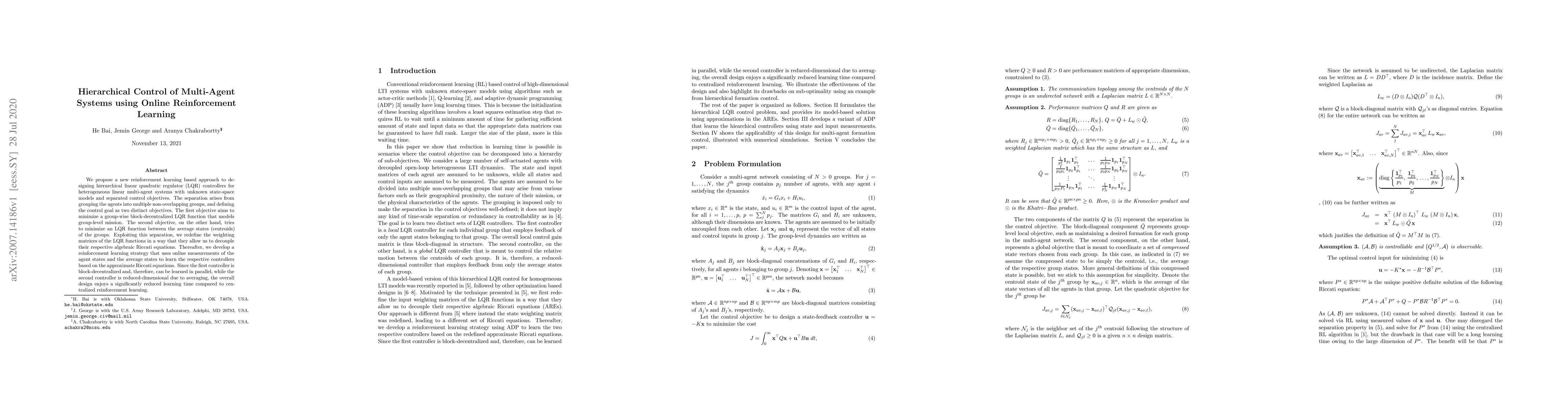 This paper proposes a reinforcement learning approach for designing hierarchical LQR controllers for multi-agent systems with unknown state-space models and separated control objectives. It employs online measurements to learn decentralized and reduced-dimensional controllers, significantly reducing learning time compared to centralized methods.