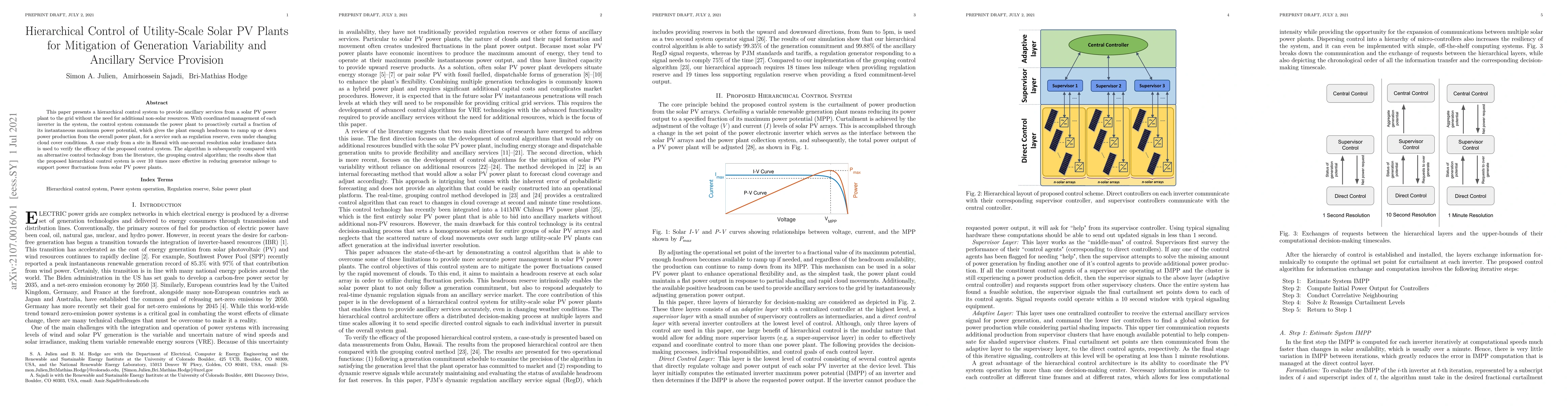 Renewable energy technologies including solar and wind inevitably play a leading role in meeting the growing demand for a decarbonized and clean power grid. However, these technologies are highly dependent of meteorological conditions of power plant site and the challenge remains on how to cope with their short-term and momentarily variability. This paper presents a hierarchical control system to provide ancillary services from a solar PV power plant to the grid without the need for additional non-solar resources. With coordinated management of each inverter in the system, the control system commands the power plant to proactively curtail a fraction of its instantaneous maximum power potential, which gives the plant enough headroom to ramp up or down power production from the overall power plant, for a service such as regulation reserve, even under changing cloud cover conditions. A case study from a site in Hawaii with one-second resolution solar irradiance data is used to verify the efficacy of the proposed control system. The algorithm is subsequently compared with an alternative control technology from the literature, the grouping control algorithm; the results show that the proposed hierarchical control system is over 10 times more effective in reducing generator mileage to support power fluctuations from solar PV power plants.