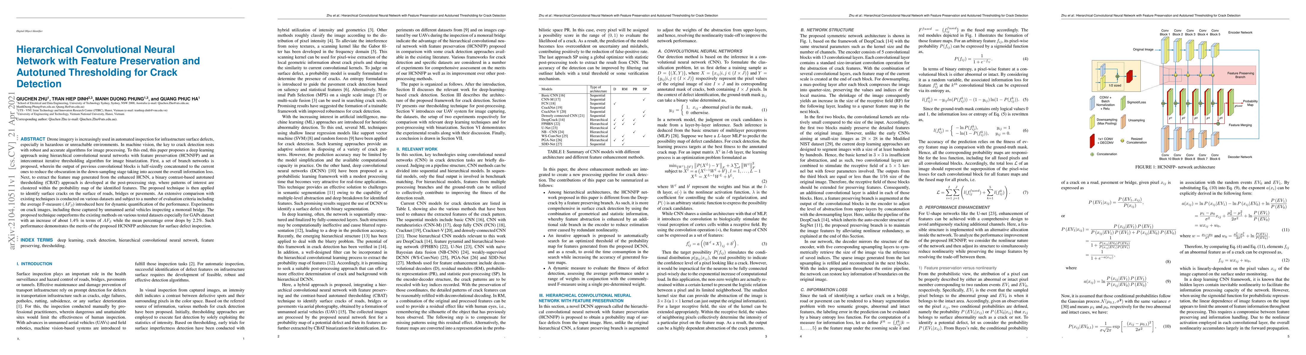 This paper proposes a hierarchical convolutional neural network (HCNNFP) with feature preservation and an autotuned thresholding algorithm for detecting cracks in infrastructure from drone imagery. The HCNNFP architecture concatenates half-sized outputs from previous convolutional blocks to minimize information loss, followed by a binary contrast-based autotuned thresholding (CBAT) method for binarization. The method outperforms existing techniques, especially for the GAPs dataset, showing a 1.4% increase in average F-measure and a 2.2% reduction in mean percentage error.