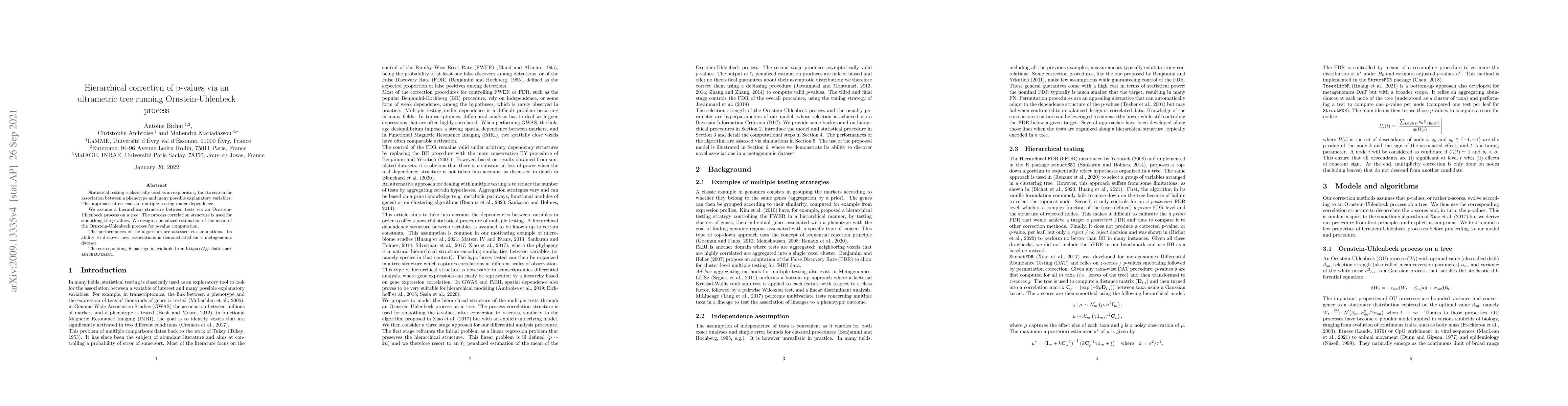 This paper proposes a method for hierarchical correction of p-values using an Ornstein-Uhlenbeck process on an ultrametric tree to account for dependencies in multiple testing. The approach employs a penalized estimation for p-value computation and demonstrates its effectiveness through simulations and a metagenomic dataset.