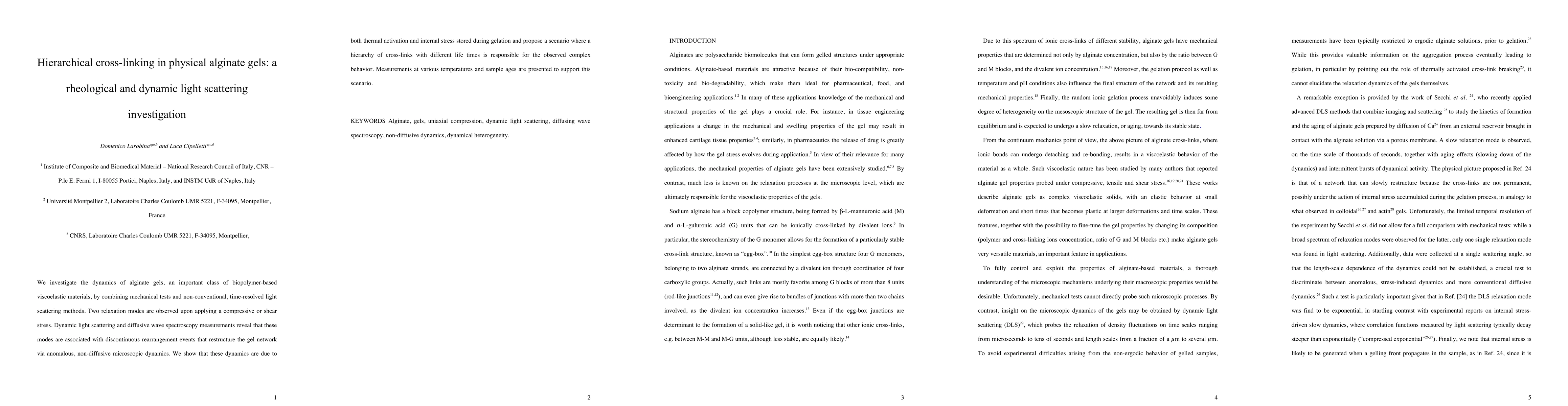 This study combines mechanical tests and dynamic light scattering to explore the complex rheological behavior of alginate gels, revealing two relaxation modes linked to hierarchical cross-linking and non-diffusive microscopic dynamics influenced by thermal activation and internal stress. The findings suggest a network restructuring mechanism driven by a hierarchy of cross-links with varying lifetimes.