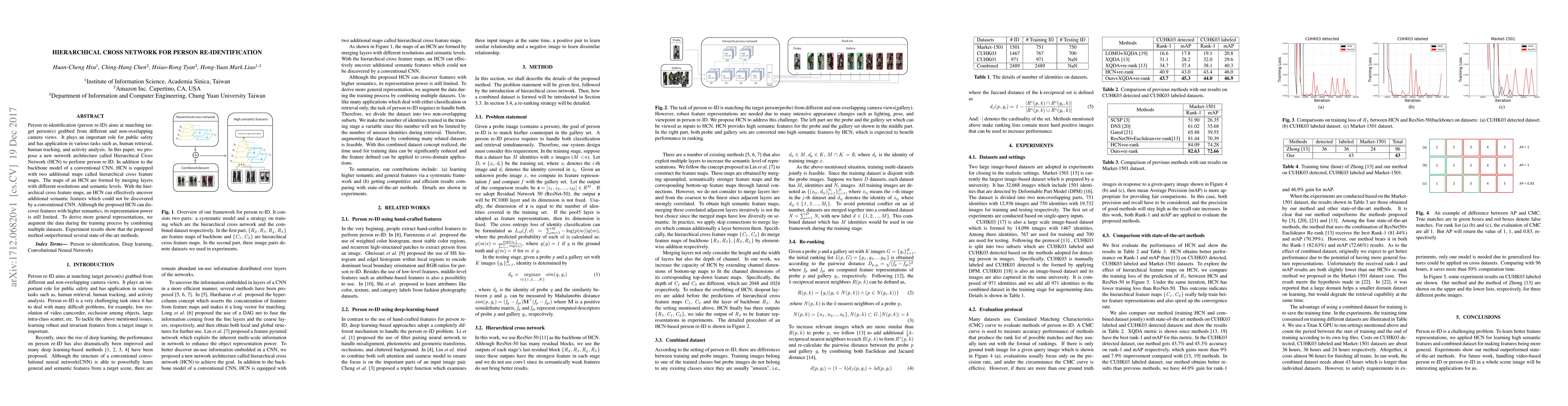 This paper proposes a Hierarchical Cross Network (HCN) for person re-identification, utilizing hierarchical cross feature maps to uncover additional semantic features beyond conventional CNNs. The method is augmented with data from multiple datasets to enhance representation, achieving superior performance over state-of-the-art methods.