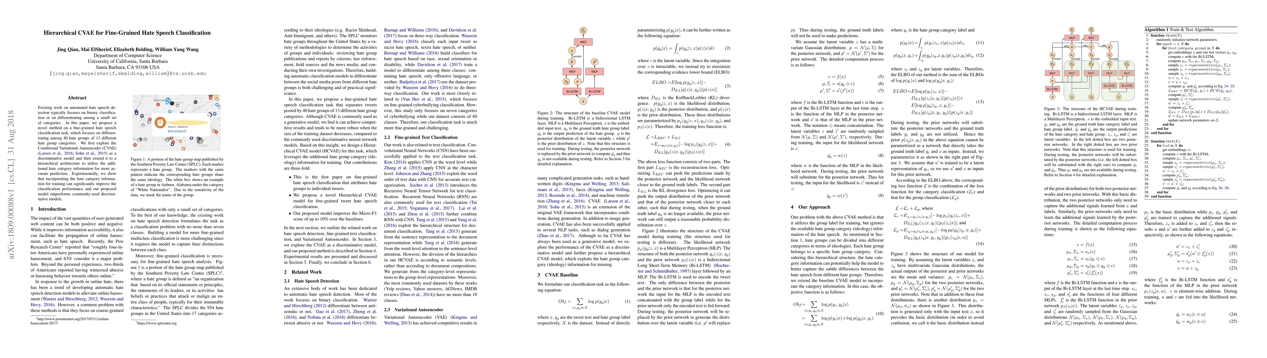 This paper proposes a hierarchical Conditional Variational Autoencoder (CVAE) for fine-grained hate speech classification, differentiating among 40 hate groups within 13 categories. The model's hierarchical structure leverages hate category information to enhance accuracy, outperforming traditional discriminative models in experiments.