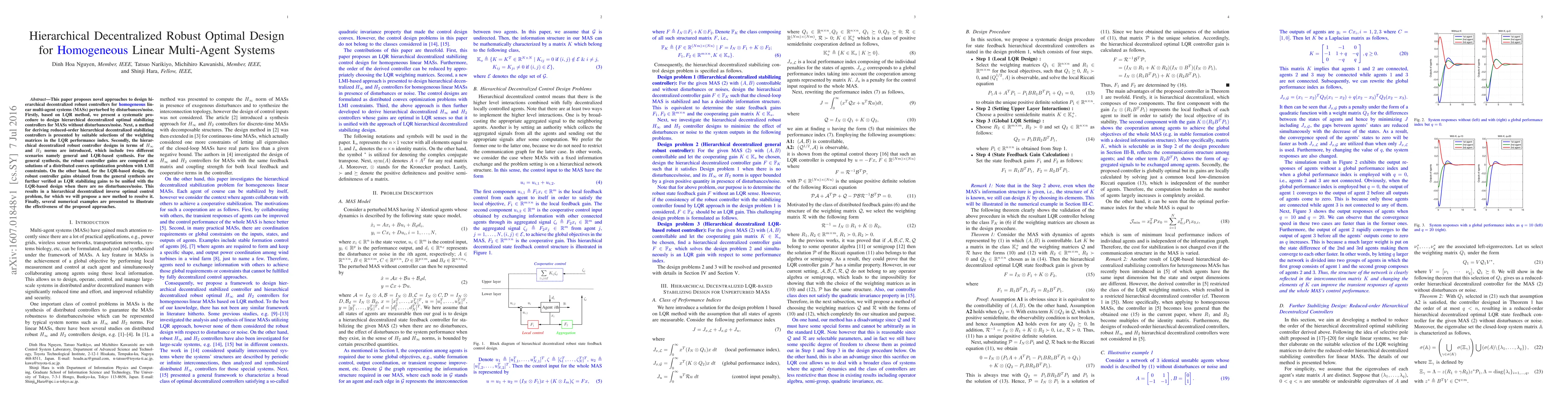 This paper proposes a systematic method for designing hierarchical decentralized robust controllers for homogeneous linear multi-agent systems, addressing both optimal stabilization and robustness against disturbances/noise through $H_{\infty}$ and $H_{2}$ norms. Numerical examples demonstrate the effectiveness of the proposed approaches.