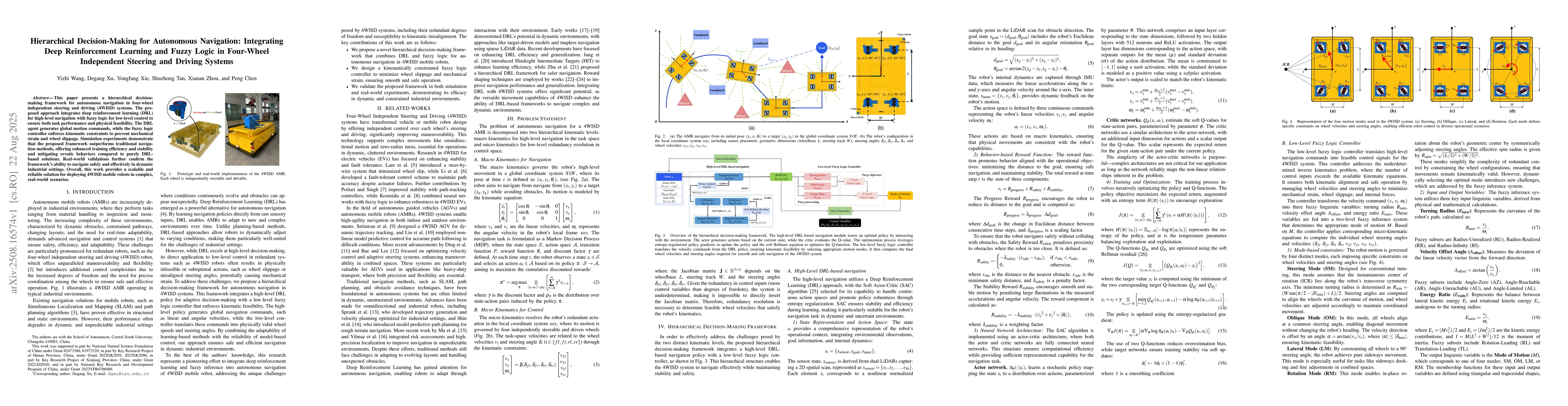 This paper presents a hierarchical decision-making framework for autonomous navigation in four-wheel independent steering and driving (4WISD) systems. The proposed approach integrates deep reinforcement learning (DRL) for high-level navigation with fuzzy logic for low-level control to ensure both task performance and physical feasibility. The DRL agent generates global motion commands, while the fuzzy logic controller enforces kinematic constraints to prevent mechanical strain and wheel slippage. Simulation experiments demonstrate that the proposed framework outperforms traditional navigation methods, offering enhanced training efficiency and stability and mitigating erratic behaviors compared to purely DRL-based solutions. Real-world validations further confirm the framework's ability to navigate safely and effectively in dynamic industrial settings. Overall, this work provides a scalable and reliable solution for deploying 4WISD mobile robots in complex, real-world scenarios.