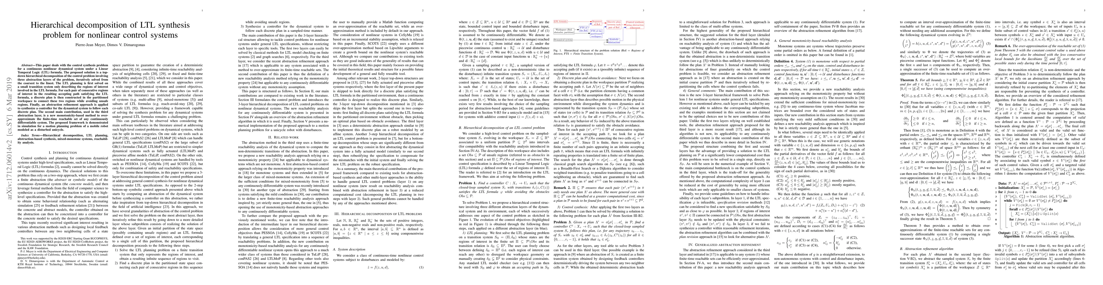 Researchers developed a hierarchical approach to solving control synthesis problems for nonlinear systems using Linear Temporal Logic (LTL). They achieved this through a three-layered decomposition method that combines discrete planning with abstraction refinement to synthesize controllers.