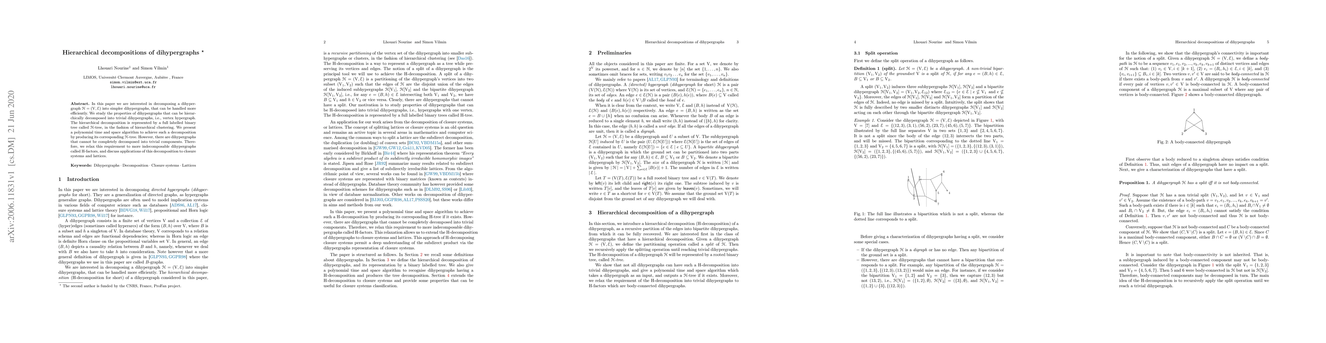 This paper presents a polynomial time and space algorithm for hierarchically decomposing dihypergraphs into simpler components, represented by an $\mathcal{H}$-tree. It discusses the limitations of complete decomposition and introduces H-factors for indecomposable dihypergraphs, with applications to closure systems and lattices.