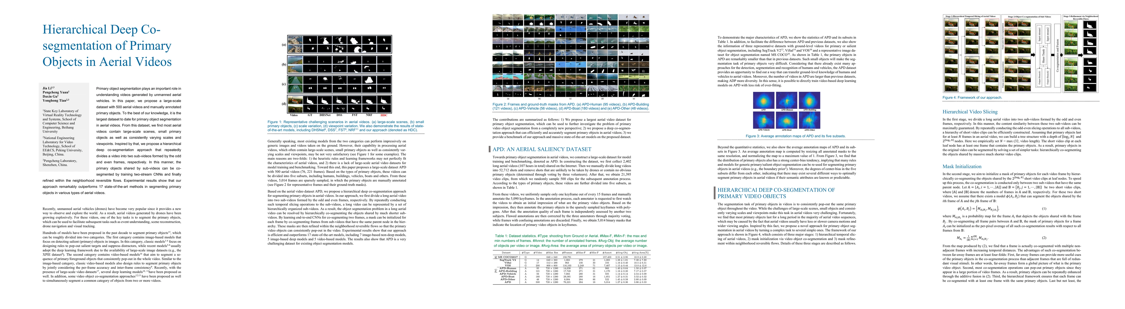 This paper introduces a large-scale dataset of 500 annotated aerial videos for primary object segmentation, and proposes a hierarchical deep co-segmentation method that outperforms 17 state-of-the-art techniques by leveraging two-stream CNNs and neighborhood reversible flows.