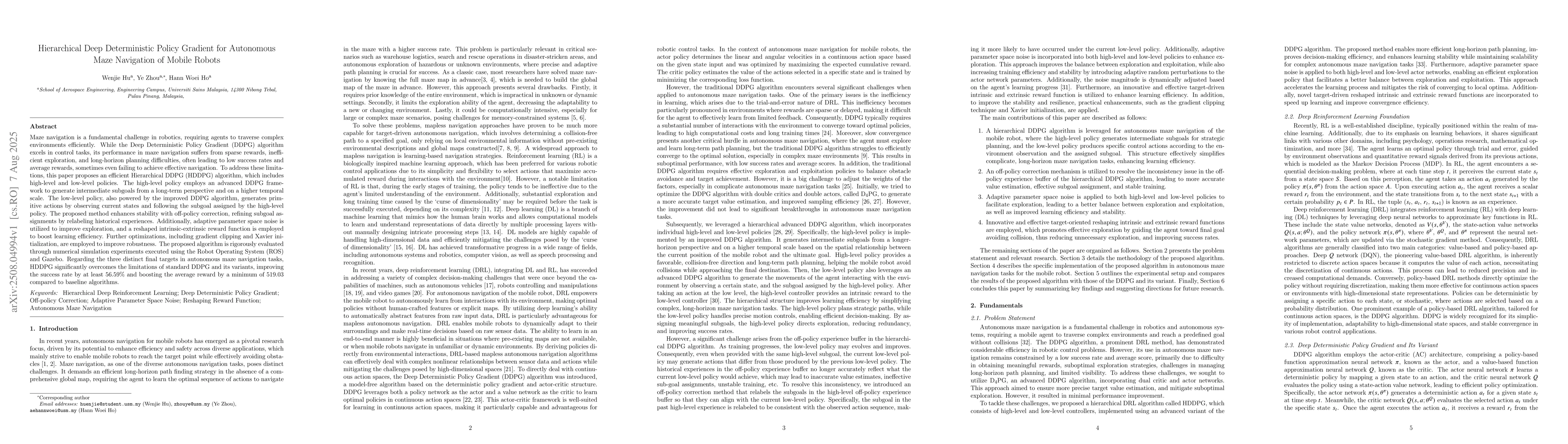 Maze navigation is a fundamental challenge in robotics, requiring agents to traverse complex environments efficiently. While the Deep Deterministic Policy Gradient (DDPG) algorithm excels in control tasks, its performance in maze navigation suffers from sparse rewards, inefficient exploration, and long-horizon planning difficulties, often leading to low success rates and average rewards, sometimes even failing to achieve effective navigation. To address these limitations, this paper proposes an efficient Hierarchical DDPG (HDDPG) algorithm, which includes high-level and low-level policies. The high-level policy employs an advanced DDPG framework to generate intermediate subgoals from a long-term perspective and on a higher temporal scale. The low-level policy, also powered by the improved DDPG algorithm, generates primitive actions by observing current states and following the subgoal assigned by the high-level policy. The proposed method enhances stability with off-policy correction, refining subgoal assignments by relabeling historical experiences. Additionally, adaptive parameter space noise is utilized to improve exploration, and a reshaped intrinsic-extrinsic reward function is employed to boost learning efficiency. Further optimizations, including gradient clipping and Xavier initialization, are employed to improve robustness. The proposed algorithm is rigorously evaluated through numerical simulation experiments executed using the Robot Operating System (ROS) and Gazebo. Regarding the three distinct final targets in autonomous maze navigation tasks, HDDPG significantly overcomes the limitations of standard DDPG and its variants, improving the success rate by at least 56.59% and boosting the average reward by a minimum of 519.03 compared to baseline algorithms.