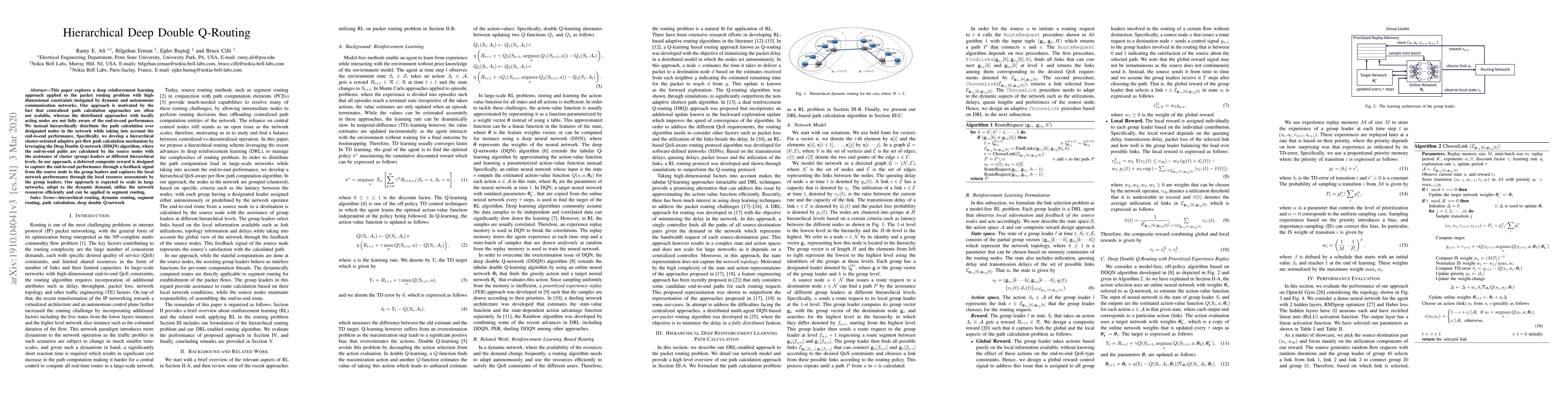This paper explores a deep reinforcement learning approach applied to the packet routing problem with high-dimensional constraints instigated by dynamic and autonomous communication networks. Our approach is motivated by the fact that centralized path calculation approaches are often not scalable, whereas the distributed approaches with locally acting nodes are not fully aware of the end-to-end performance. We instead hierarchically distribute the path calculation over designated nodes in the network while taking into account the end-to-end performance. Specifically, we develop a hierarchical cluster-oriented adaptive per-flow path calculation mechanism by leveraging the Deep Double Q-network (DDQN) algorithm, where the end-to-end paths are calculated by the source nodes with the assistance of cluster (group) leaders at different hierarchical levels. In our approach, a deferred composite reward is designed to capture the end-to-end performance through a feedback signal from the source nodes to the group leaders and captures the local network performance through the local resource assessments by the group leaders. This approach scales in large networks, adapts to the dynamic demand, utilizes the network resources efficiently and can be applied to segment routing.