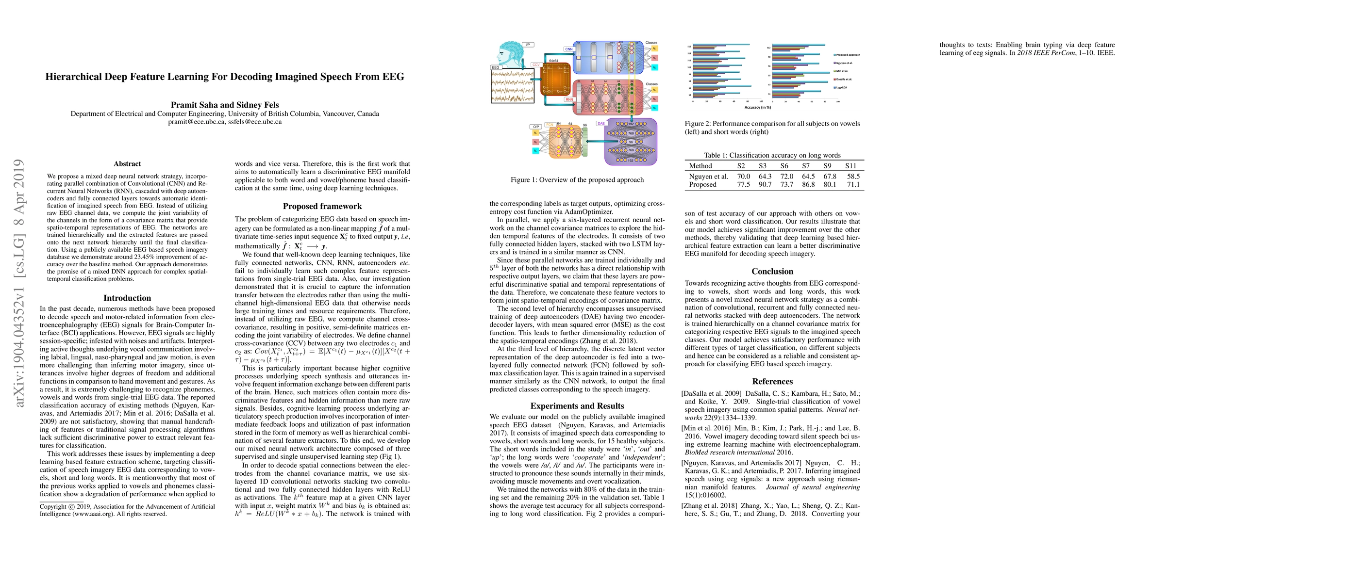 This paper proposes a mixed deep neural network combining CNNs, RNNs, autoencoders, and fully connected layers to decode imagined speech from EEG data. The method uses covariance matrices of EEG channels for spatio-temporal representations, achieving a 23.45% accuracy improvement over baseline methods.