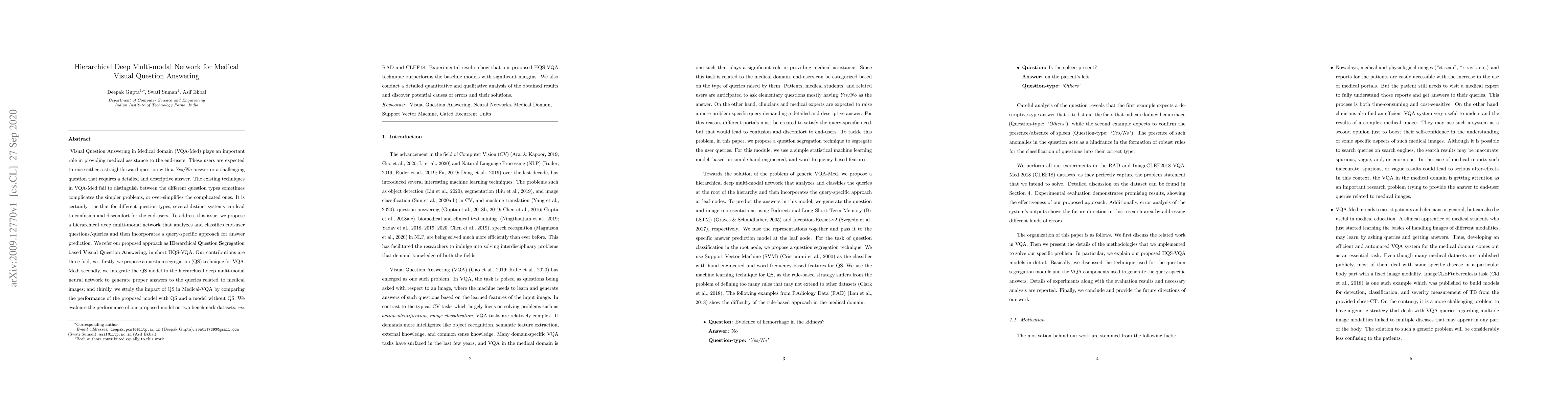 The paper proposes a hierarchical deep multi-modal network called HQS-VQA for Visual Question Answering in the medical domain, which segregates questions to provide appropriate answers. The model outperforms baseline models on benchmark datasets, demonstrating improved performance through question classification and tailored answer prediction strategies.