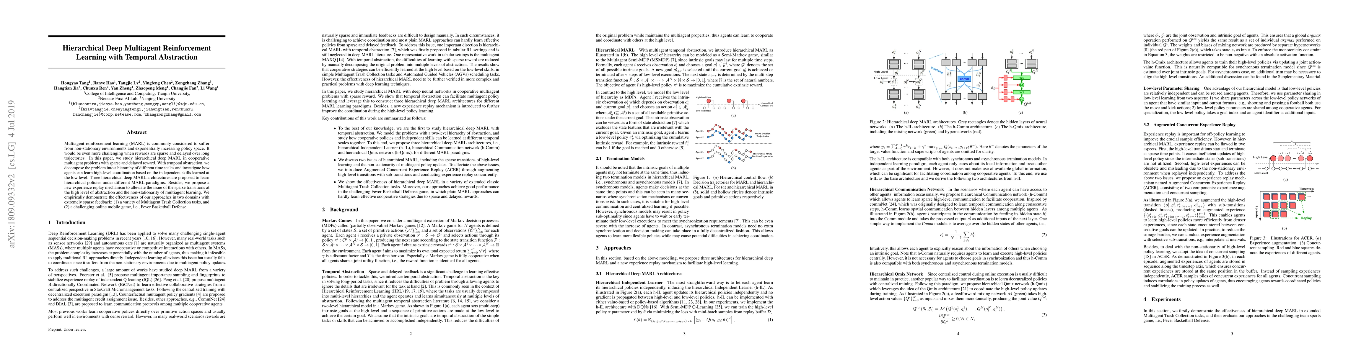 This paper proposes hierarchical deep multiagent reinforcement learning with temporal abstraction to tackle the challenges of sparse and delayed rewards in cooperative multiagent tasks. It introduces three architectures to learn hierarchical policies and a new experience replay mechanism to address non-stationarity and sparse transitions. The effectiveness is demonstrated in Multiagent Trash Collection and Fever Basketball Defense.