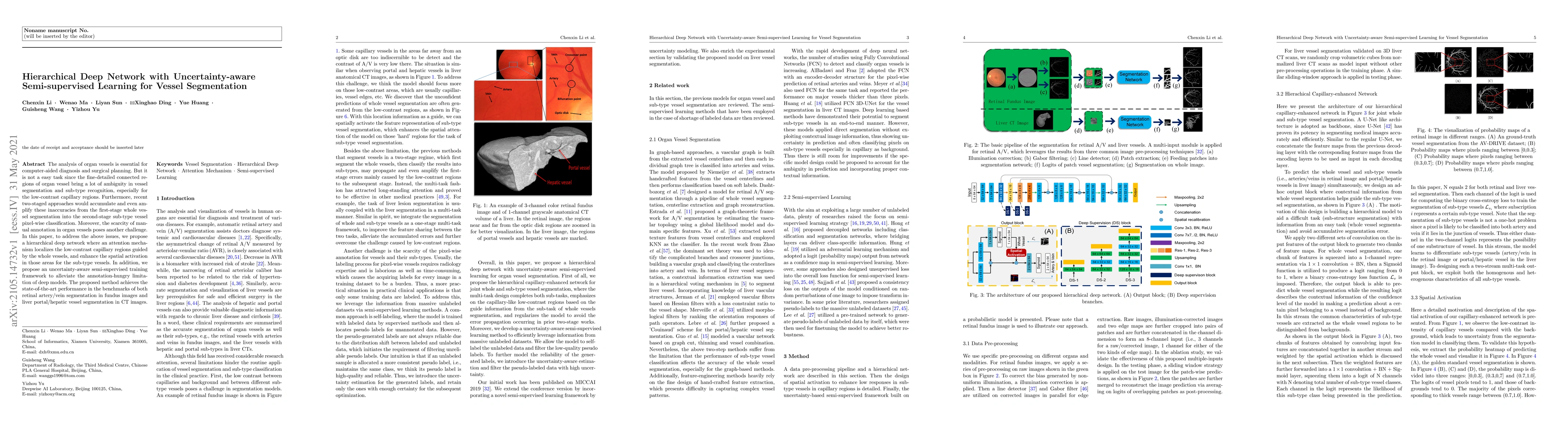 This paper proposes a hierarchical deep network with an attention mechanism to localize and enhance low-contrast capillary regions for vessel segmentation, coupled with an uncertainty-aware semi-supervised learning framework to address the scarcity of annotations. The method achieves state-of-the-art performance in retinal and liver vessel segmentation tasks.