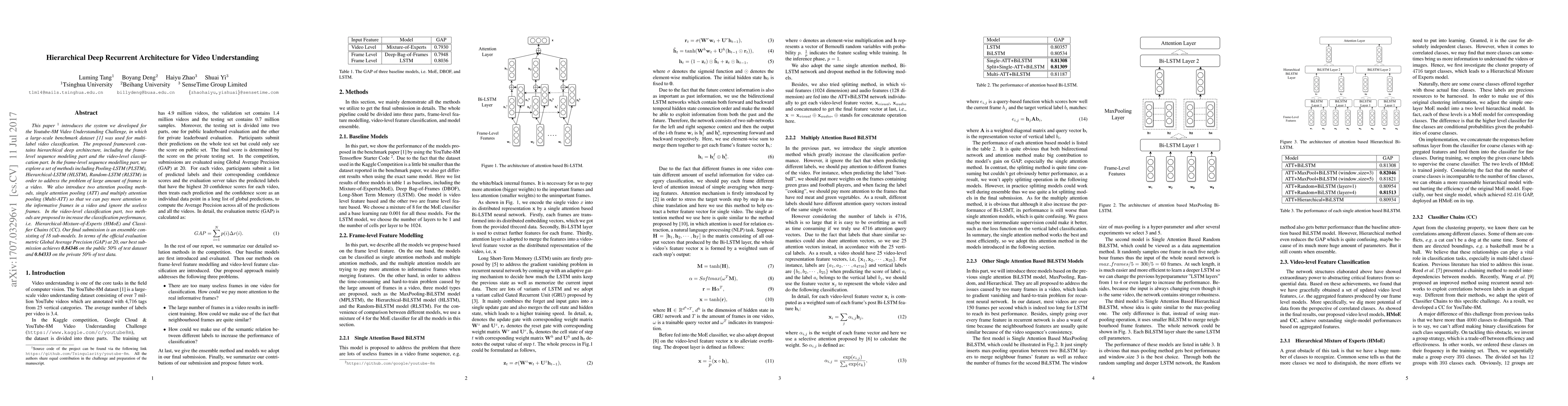 This paper introduces the system we developed for the Youtube-8M Video Understanding Challenge, in which a large-scale benchmark dataset was used for multi-label video classification. The proposed framework contains hierarchical deep architecture, including the frame-level sequence modeling part and the video-level classification part. In the frame-level sequence modelling part, we explore a set of methods including Pooling-LSTM (PLSTM), Hierarchical-LSTM (HLSTM), Random-LSTM (RLSTM) in order to address the problem of large amount of frames in a video. We also introduce two attention pooling methods, single attention pooling (ATT) and multiply attention pooling (Multi-ATT) so that we can pay more attention to the informative frames in a video and ignore the useless frames. In the video-level classification part, two methods are proposed to increase the classification performance, i.e. Hierarchical-Mixture-of-Experts (HMoE) and Classifier Chains (CC). Our final submission is an ensemble consisting of 18 sub-models. In terms of the official evaluation metric Global Average Precision (GAP) at 20, our best submission achieves 0.84346 on the public 50% of test dataset and 0.84333 on the private 50% of test data.