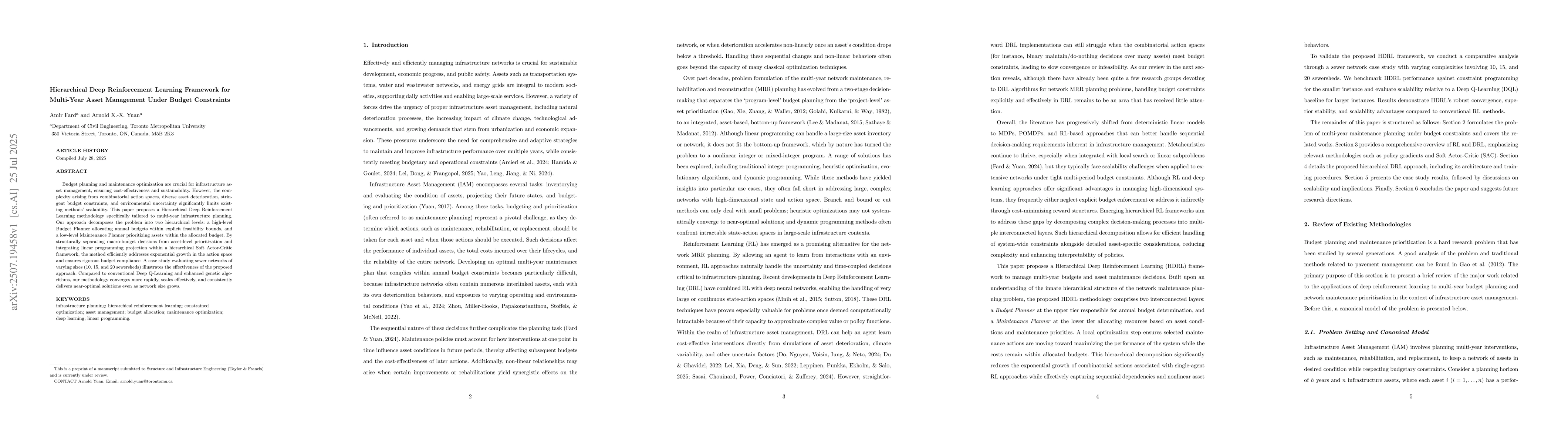 Budget planning and maintenance optimization are crucial for infrastructure asset management, ensuring cost-effectiveness and sustainability. However, the complexity arising from combinatorial action spaces, diverse asset deterioration, stringent budget constraints, and environmental uncertainty significantly limits existing methods' scalability. This paper proposes a Hierarchical Deep Reinforcement Learning methodology specifically tailored to multi-year infrastructure planning. Our approach decomposes the problem into two hierarchical levels: a high-level Budget Planner allocating annual budgets within explicit feasibility bounds, and a low-level Maintenance Planner prioritizing assets within the allocated budget. By structurally separating macro-budget decisions from asset-level prioritization and integrating linear programming projection within a hierarchical Soft Actor-Critic framework, the method efficiently addresses exponential growth in the action space and ensures rigorous budget compliance. A case study evaluating sewer networks of varying sizes (10, 15, and 20 sewersheds) illustrates the effectiveness of the proposed approach. Compared to conventional Deep Q-Learning and enhanced genetic algorithms, our methodology converges more rapidly, scales effectively, and consistently delivers near-optimal solutions even as network size grows.