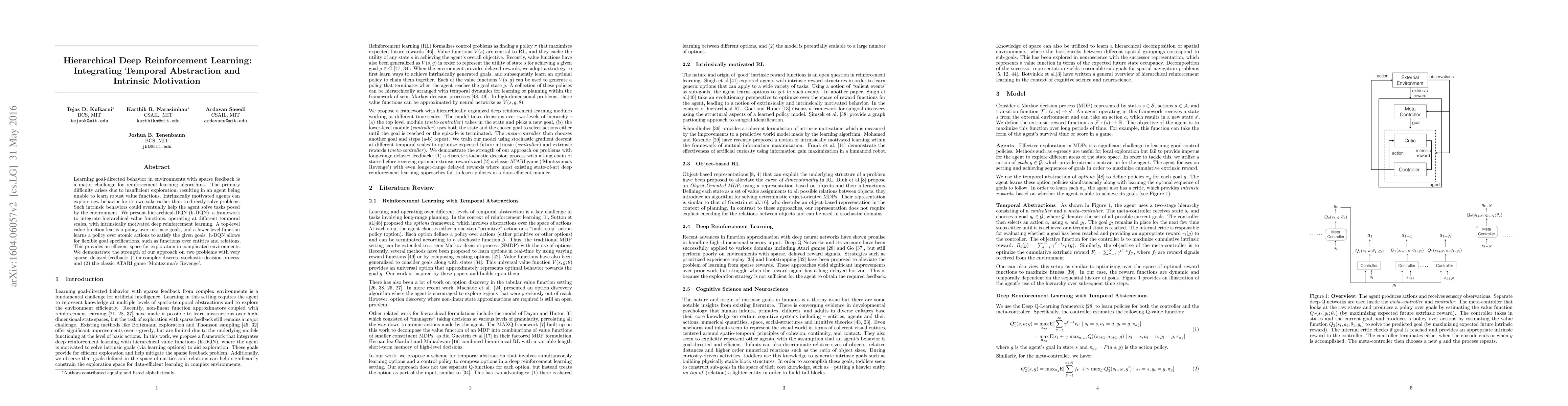 This paper introduces hierarchical-DQN (h-DQN), a framework combining hierarchical value functions and intrinsically motivated deep reinforcement learning to tackle sparse feedback challenges. The approach enables flexible goal specifications and efficient exploration in complex environments, demonstrated effectively in two sparse feedback scenarios.