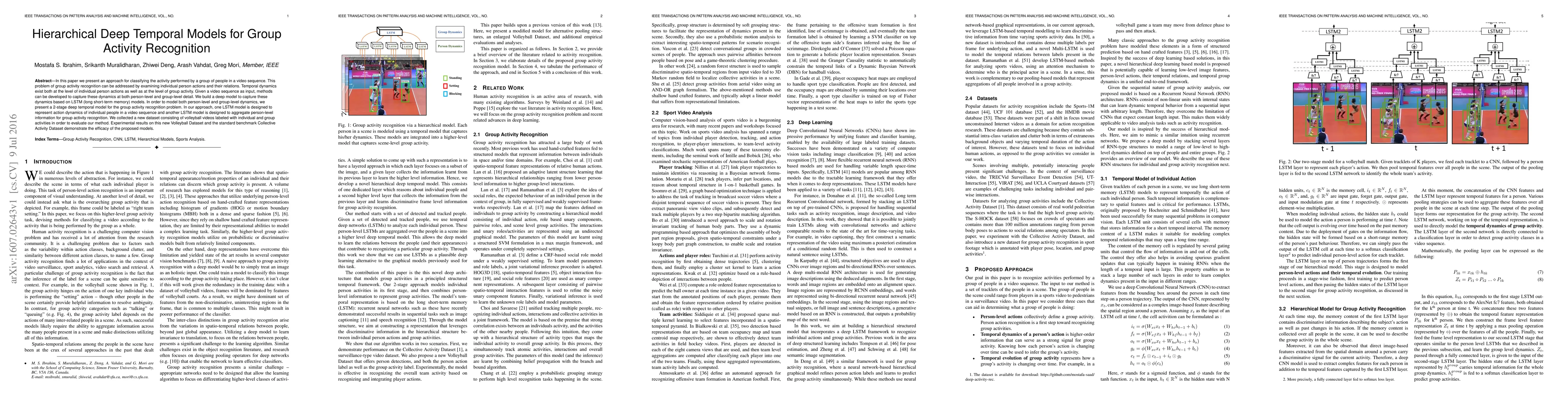 This paper proposes a hierarchical deep temporal model using LSTMs to classify group activities in video sequences by separately capturing individual person actions and their relations, followed by aggregating this information for group-level recognition. Experimental results on a new Volleyball Dataset and a benchmark show the model's effectiveness.