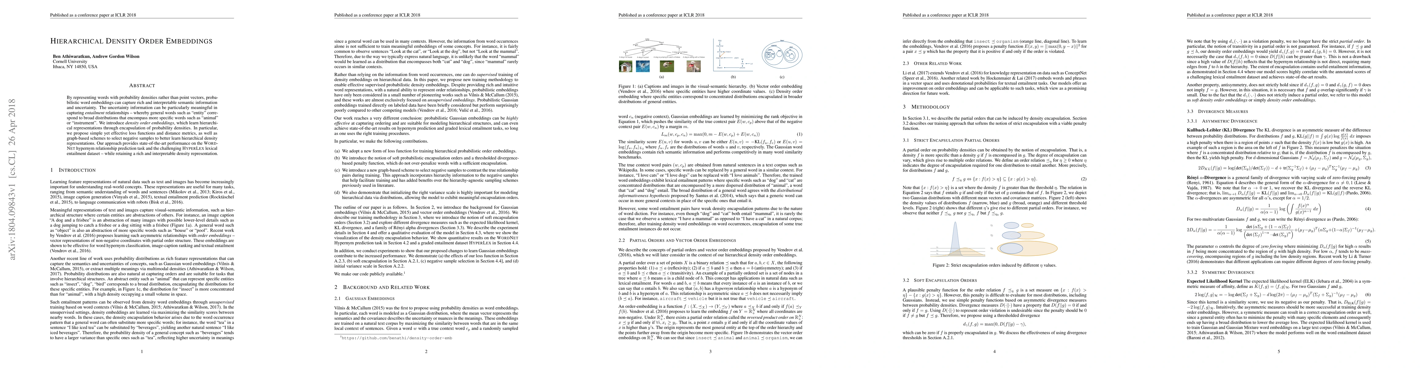 This paper introduces density order embeddings to represent words as probability densities, capturing semantic information and uncertainty. The proposed hierarchical representations, along with effective loss functions and graph-based negative sample selection, achieve state-of-the-art results on WordNet hypernym prediction and HyperLex lexical entailment tasks.