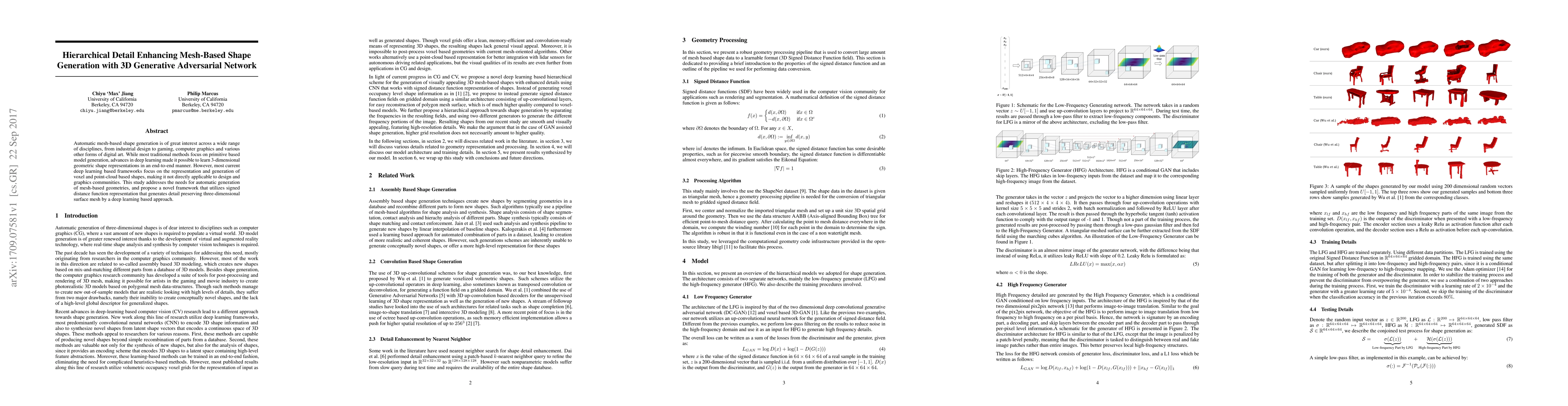 Automatic mesh-based shape generation is of great interest across a wide range of disciplines, from industrial design to gaming, computer graphics and various other forms of digital art. While most traditional methods focus on primitive based model generation, advances in deep learning made it possible to learn 3-dimensional geometric shape representations in an end-to-end manner. However, most current deep learning based frameworks focus on the representation and generation of voxel and point-cloud based shapes, making it not directly applicable to design and graphics communities. This study addresses the needs for automatic generation of mesh-based geometries, and propose a novel framework that utilizes signed distance function representation that generates detail preserving three-dimensional surface mesh by a deep learning based approach.