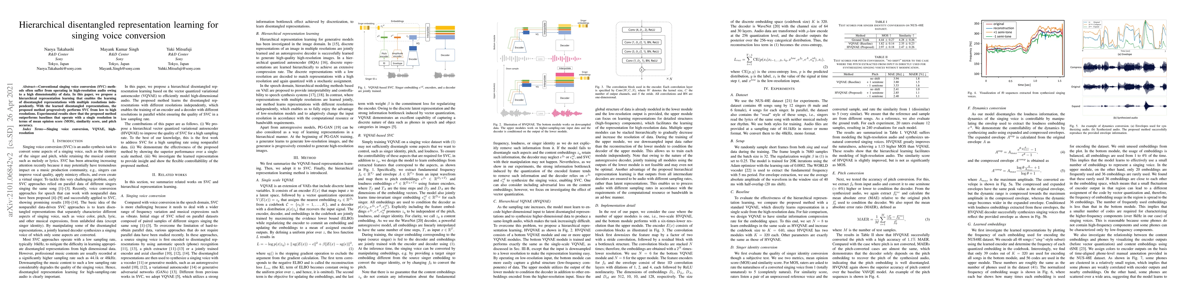 This paper proposes a hierarchical disentangled representation learning method for singing voice conversion, enabling independent learning of representations at multiple resolutions. The method outperforms single-resolution baselines in mean opinion score, similarity, and pitch accuracy.