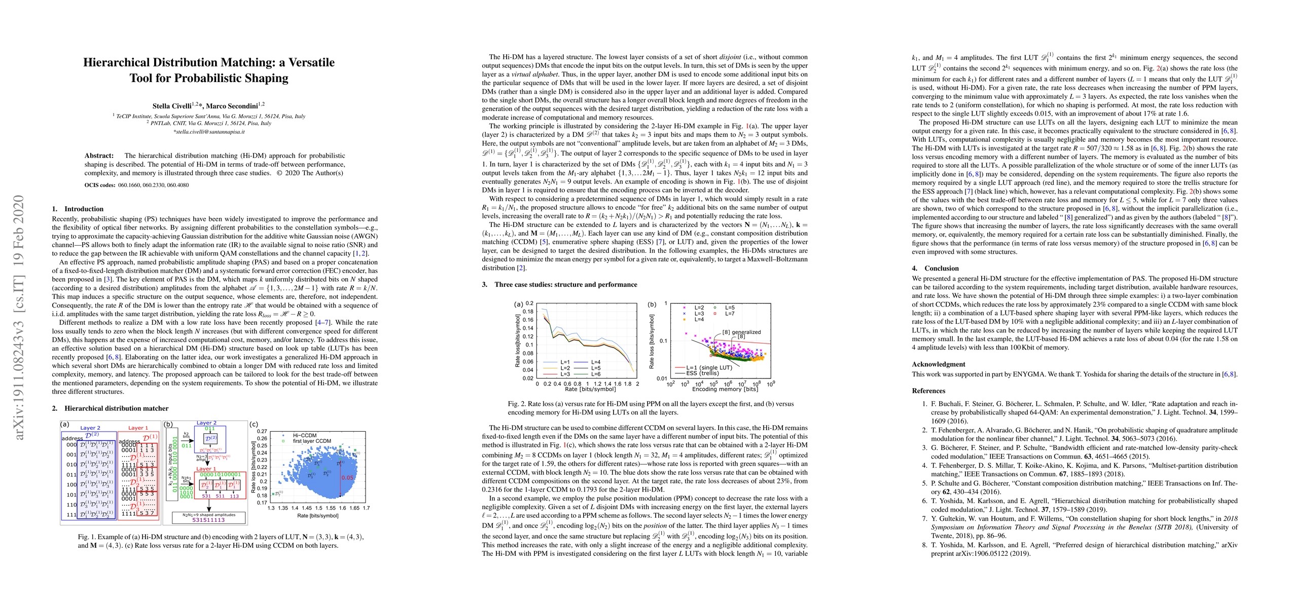 Summary: Hierarchical distribution matching (Hi-DM) is presented as an effective probabilistic shaping method, balancing performance, complexity, and memory usage, demonstrated through three case studies. This approach offers a versatile tool for optimizing communication systems.