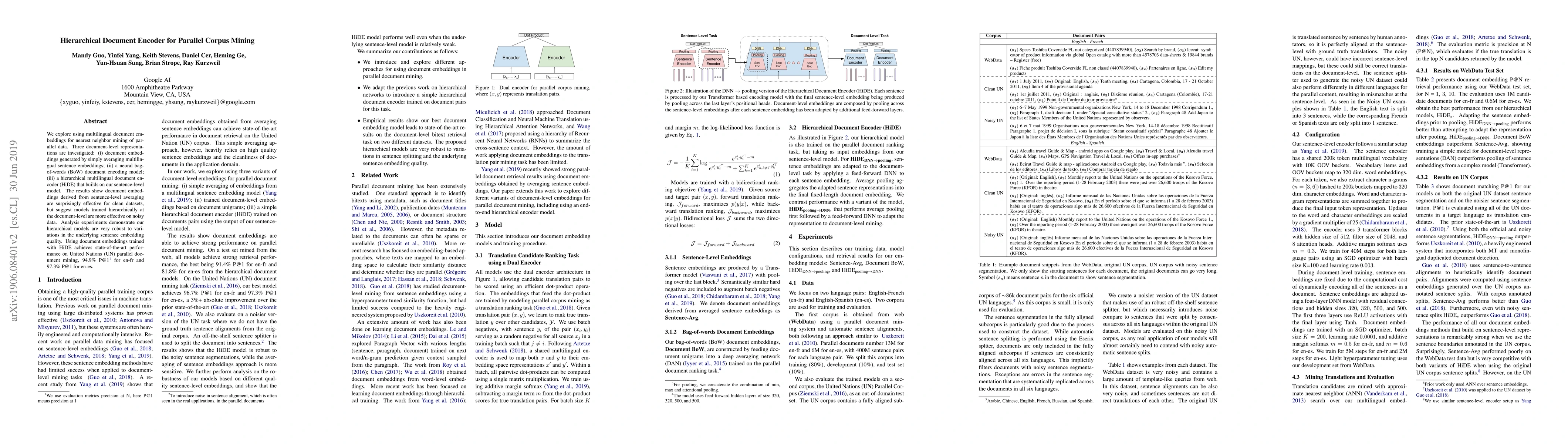 This paper investigates multilingual document embeddings for parallel corpus mining, comparing three methods: simple averaging, a neural bag-of-words model, and a hierarchical encoder. The hierarchical model achieves state-of-the-art results on UN parallel document mining, demonstrating robustness to sentence embedding quality variations.