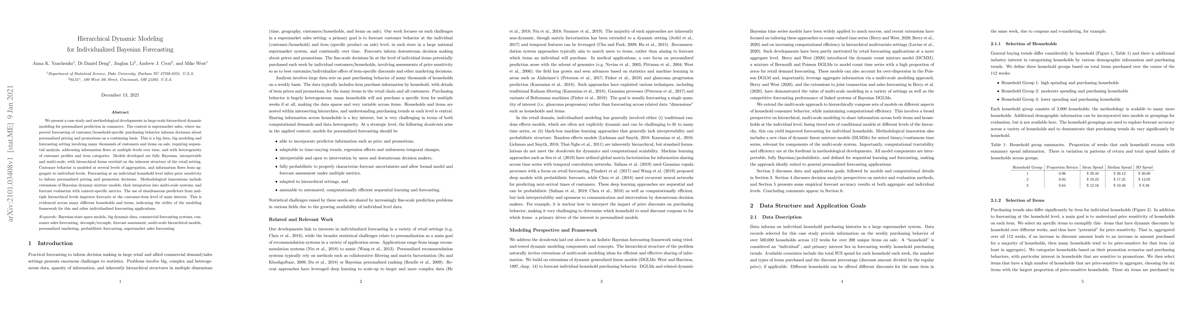 This paper develops hierarchical dynamic Bayesian models for personalized forecasting of supermarket sales, focusing on customer-specific purchasing behavior to inform tailored pricing and promotions. The approach integrates multi-level information flows and demonstrates improved forecasting accuracy across various households and items.