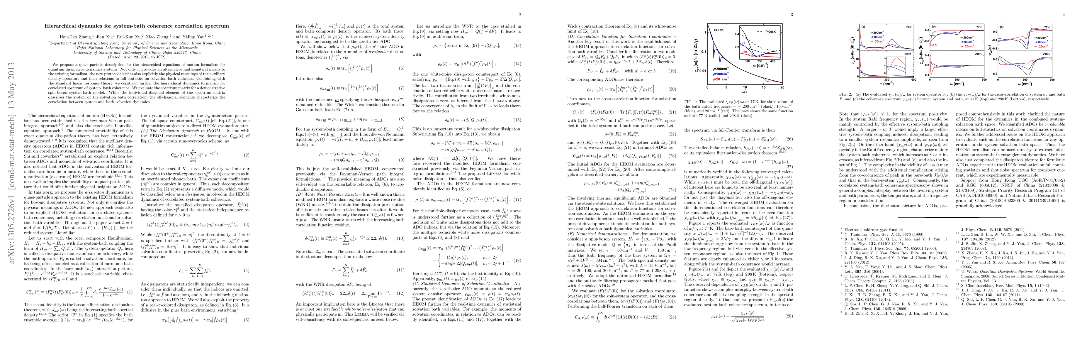 We propose a quasi-particle description for the hierarchical equations of motion formalism for quantum dissipative dynamics systems. Not only it provides an alternative mathematical means to the existing formalism, the new protocol clarifies also explicitly the physical meanings of the auxiliary density operators and their relations to full statistics on solvation bath variables. Combining with the standard linear response theory, we construct further the hierarchical dynamics formalism for correlated spectrum of system--bath coherence. We evaluate the spectrum matrix for a demonstrative spin-boson system-bath model. While the individual diagonal element of the spectrum matrix describes the system or the solvation bath correlation, the off-diagonal elements characterize the correlation between system and bath solvation dynamics.