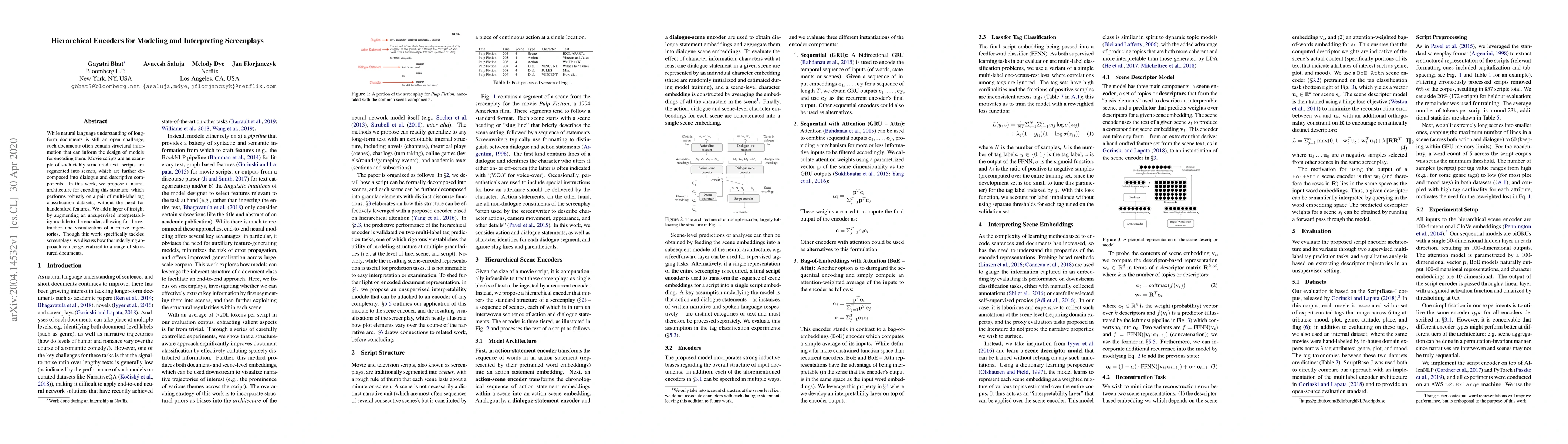 This paper proposes a neural architecture using hierarchical encoders to model and interpret movie screenplays, leveraging their structural segmentation into scenes and dialogue. The model demonstrates robust performance on multi-label classification tasks and includes an interpretability module for visualizing narrative trajectories.