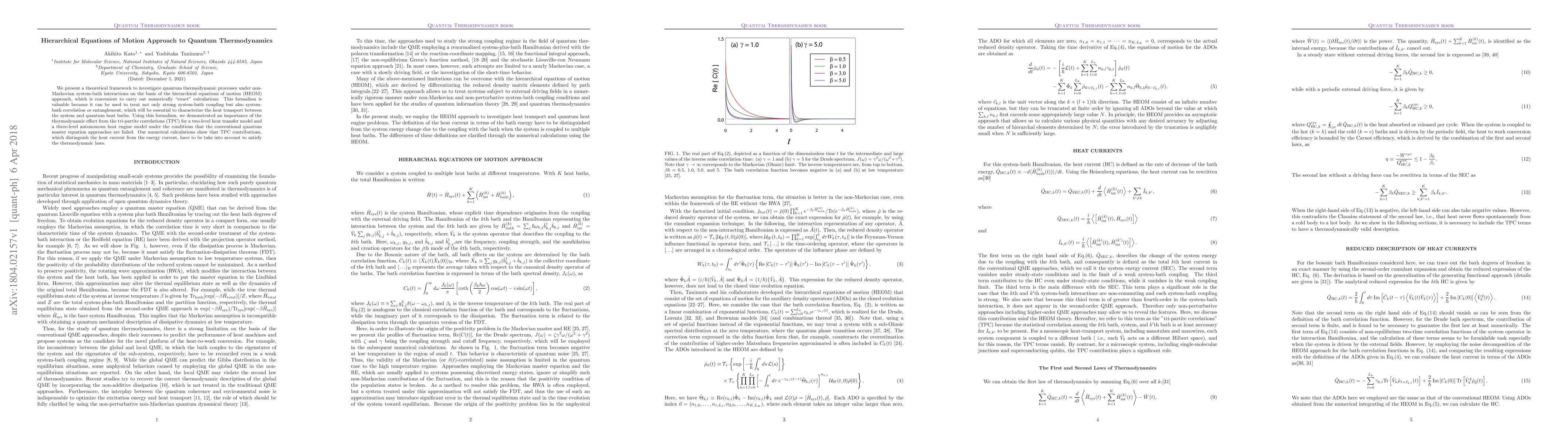 A new theoretical framework using hierarchical equations of motion approach is proposed to study quantum thermodynamic processes, highlighting the importance of tri-partite correlations in heat transport between systems and quantum baths.
