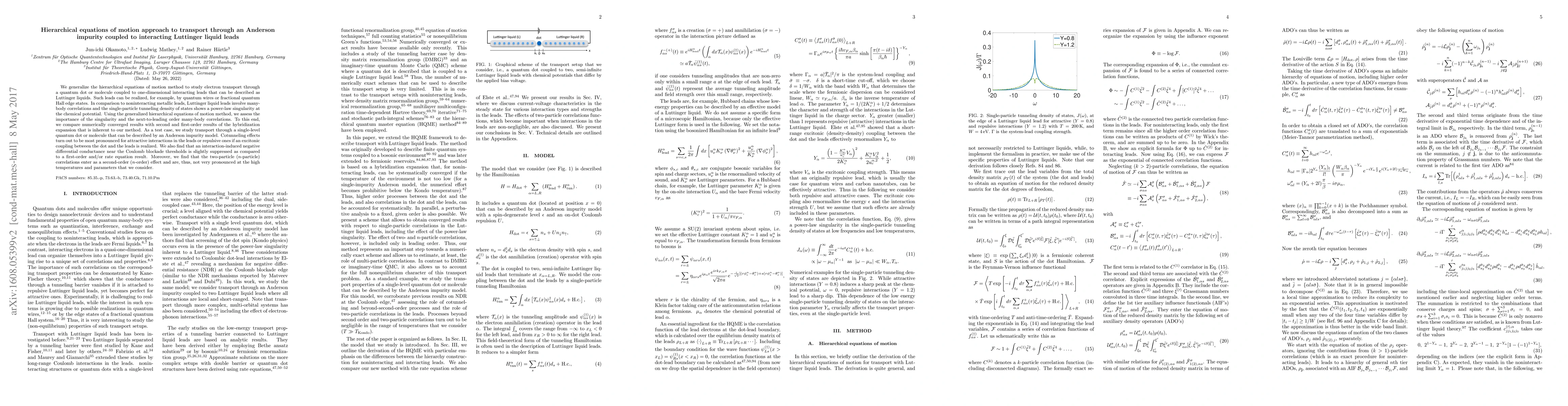 We generalize the hierarchical equations of motion method to study electron transport through a quantum dot or molecule coupled to one-dimensional interacting leads that can be described as Luttinger liquids. Such leads can be realized, for example, by quantum wires or fractional quantum Hall edge states. In comparison to noninteracting metallic leads, Luttinger liquid leads involve many-body correlations and the single-particle tunneling density of states shows a power-law singularity at the chemical potential. Using the generalized hierarchical equations of motion method, we assess the importance of the singularity and the next-to-leading order many-body correlations. To this end, we compare numerically converged results with second and first-order results of the hybridization expansion that is inherent to our method. As a test case, we study transport through a single-level quantum dot or molecule that can be described by an Anderson impurity model. Cotunneling effects turn out to be most pronounced for attractive interactions in the leads or repulsive ones if an excitonic coupling between the dot and the leads is realized. We also find that an interaction-induced negative differential conductance near the Coulomb blockade thresholds is slightly suppressed as compared to a first-order and/or rate equation result. Moreover, we find that the two-particle ($n$-particle) correlations enter as a second-order ($n$-order) effect and are, thus, not very pronounced at the high temperatures and parameters that we consider.